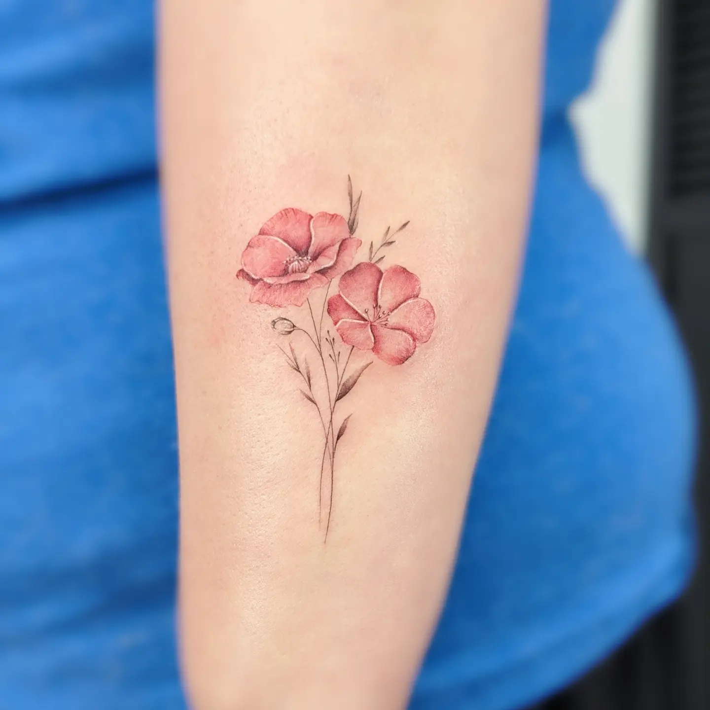 The tattoo features delicate blue poppies with intricate details and soft shading.