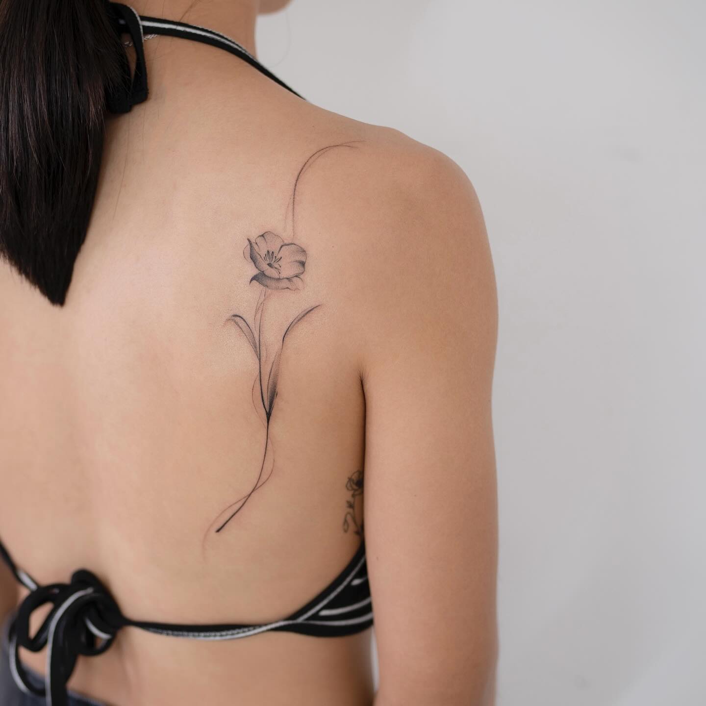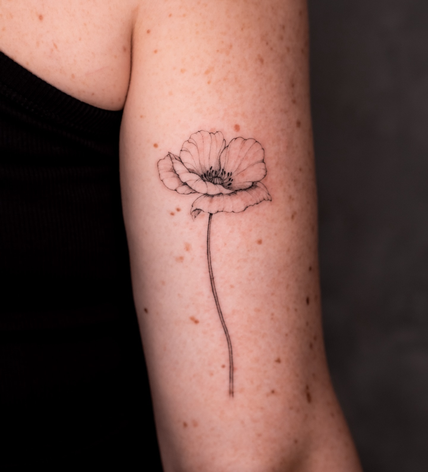 The tattoo features a single poppy flower, elegantly positioned at the shoulder, with slender lines extending gracefully down the skin.