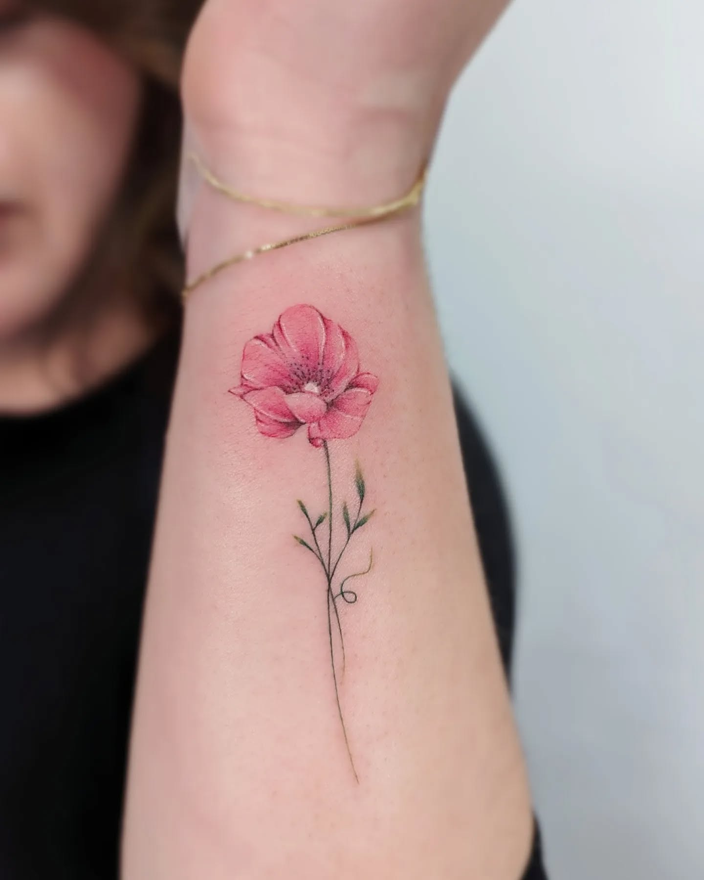 The tattoo features a finely detailed poppy flower with delicate petals and a slender stem that adds elegance.