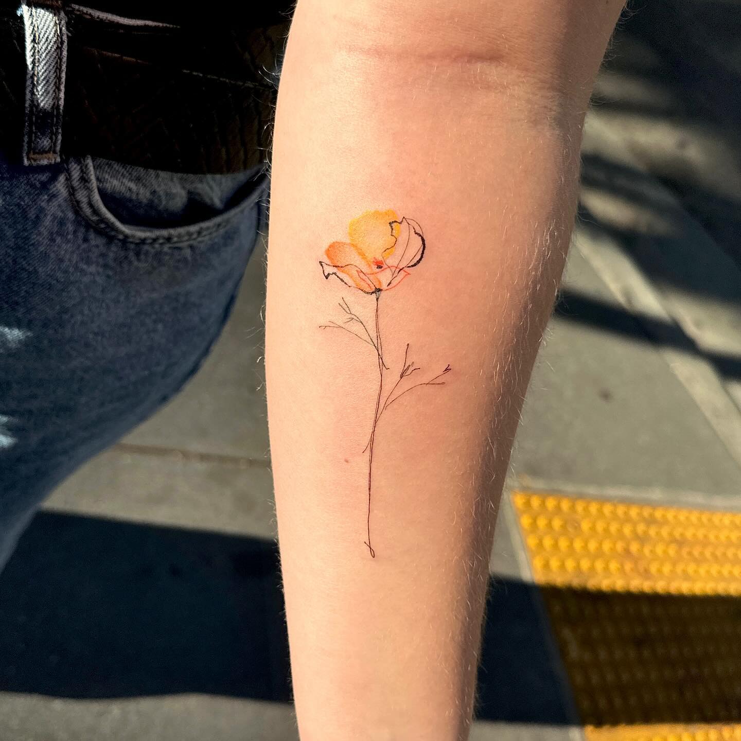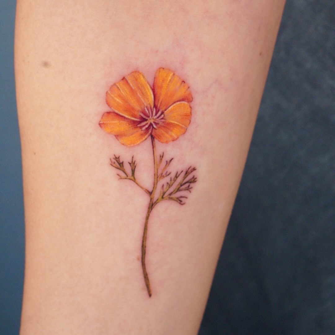 The tattoo features a single, delicate poppy flower with soft orange and yellow hues.