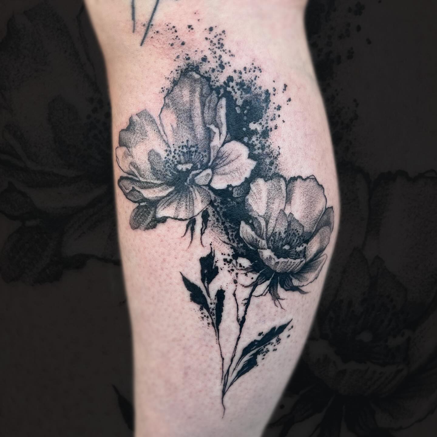 The use of ink splashes around the flowers adds a dynamic element, creating a sense of movement and depth that draws the eye.