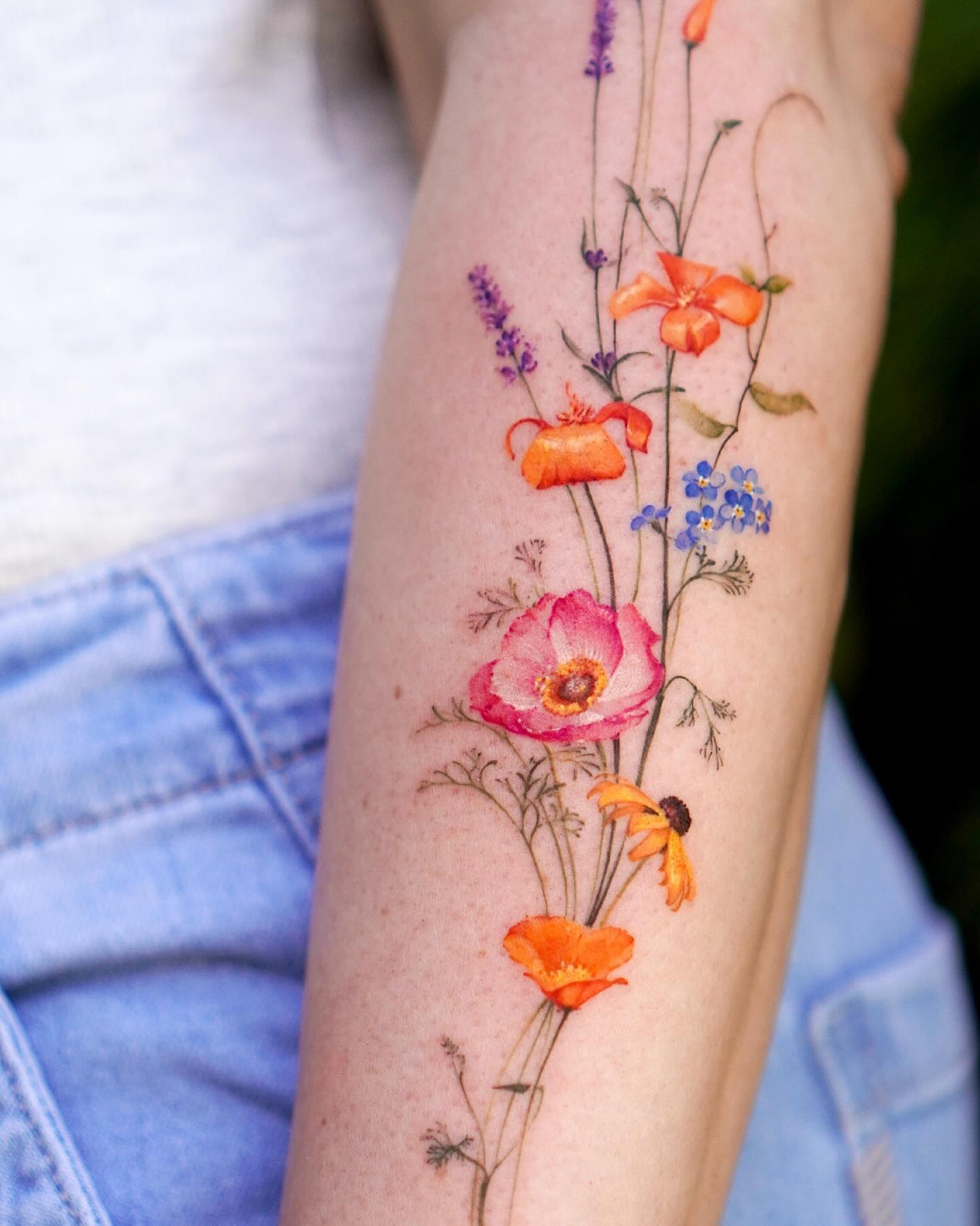 The tattoo features a delicate arrangement of colorful flowers, including poppies, lavender, and forget-me-nots.
