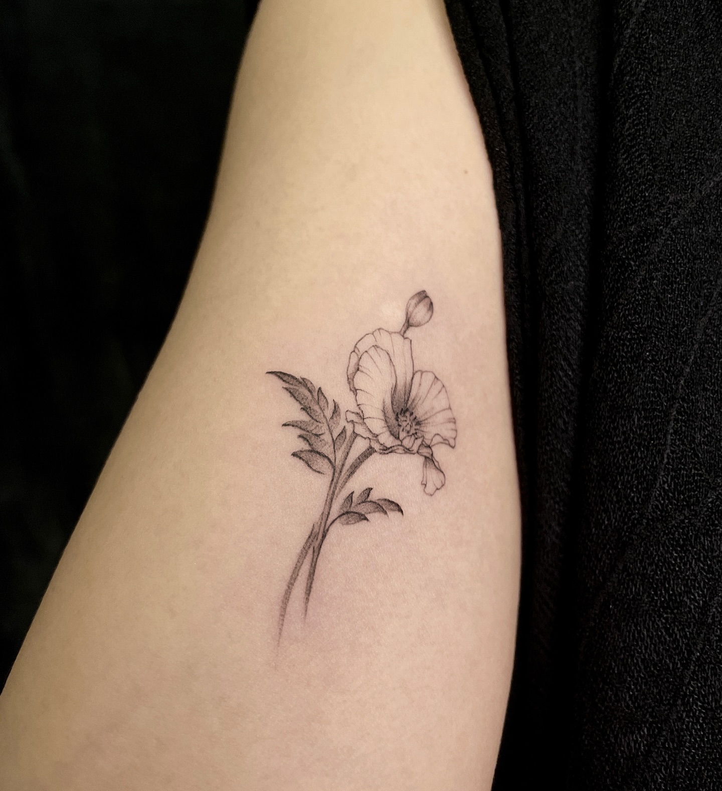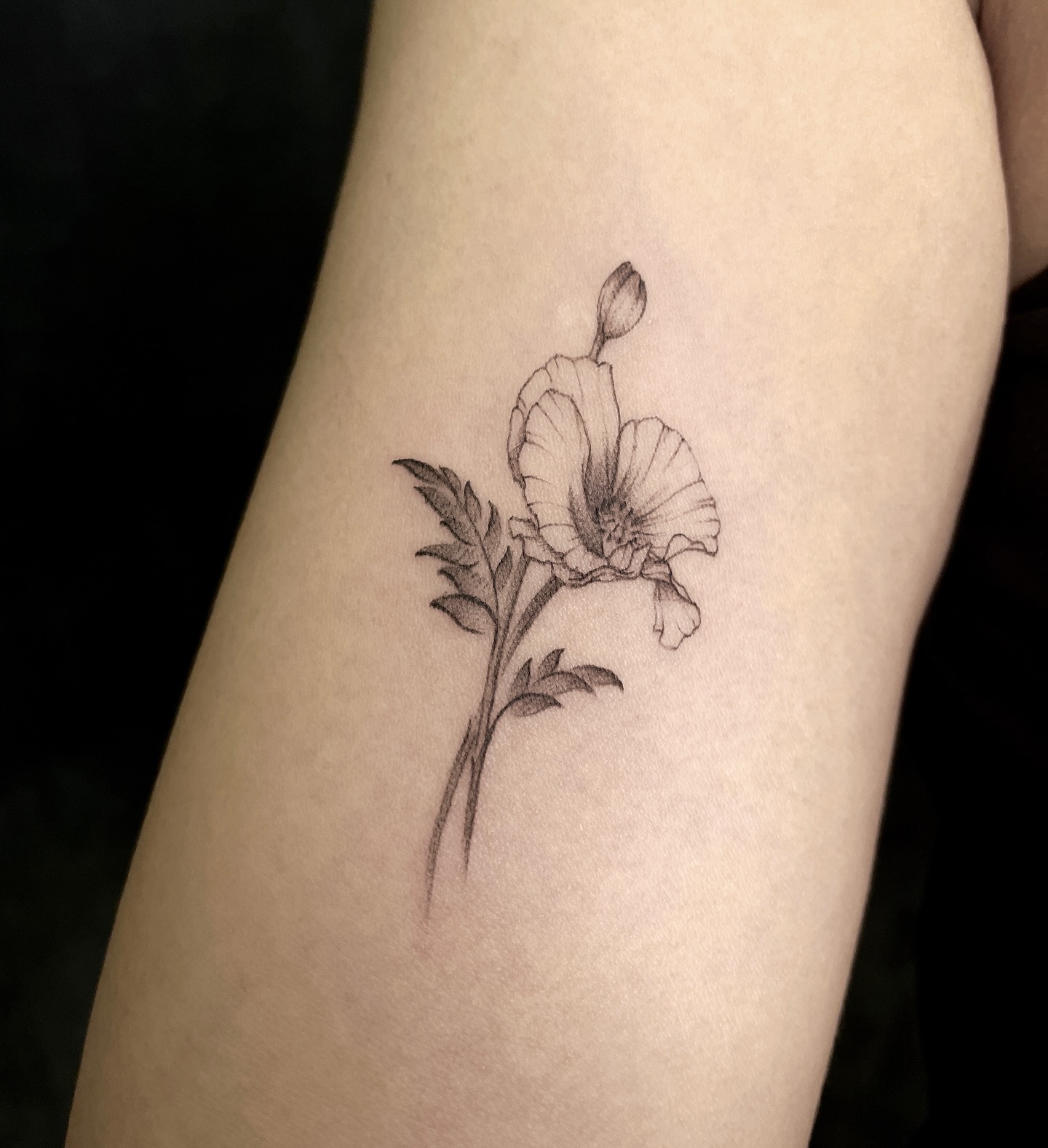 The tattoo showcases a finely detailed poppy flower with delicate petals and a budding bloom.