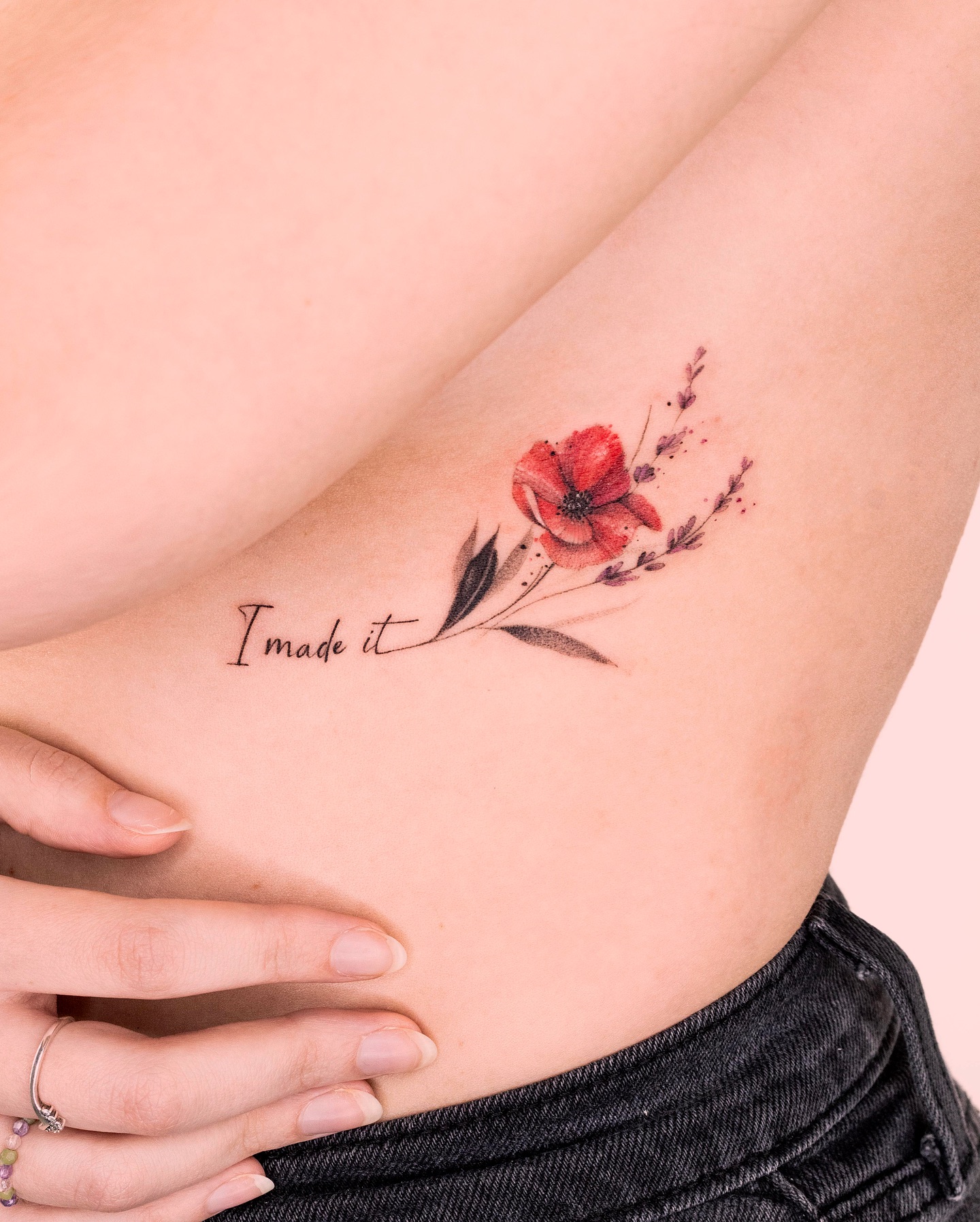 The tattoo features a vibrant red poppy flower accompanied by delicate lavender sprigs and the phrase “I made it.