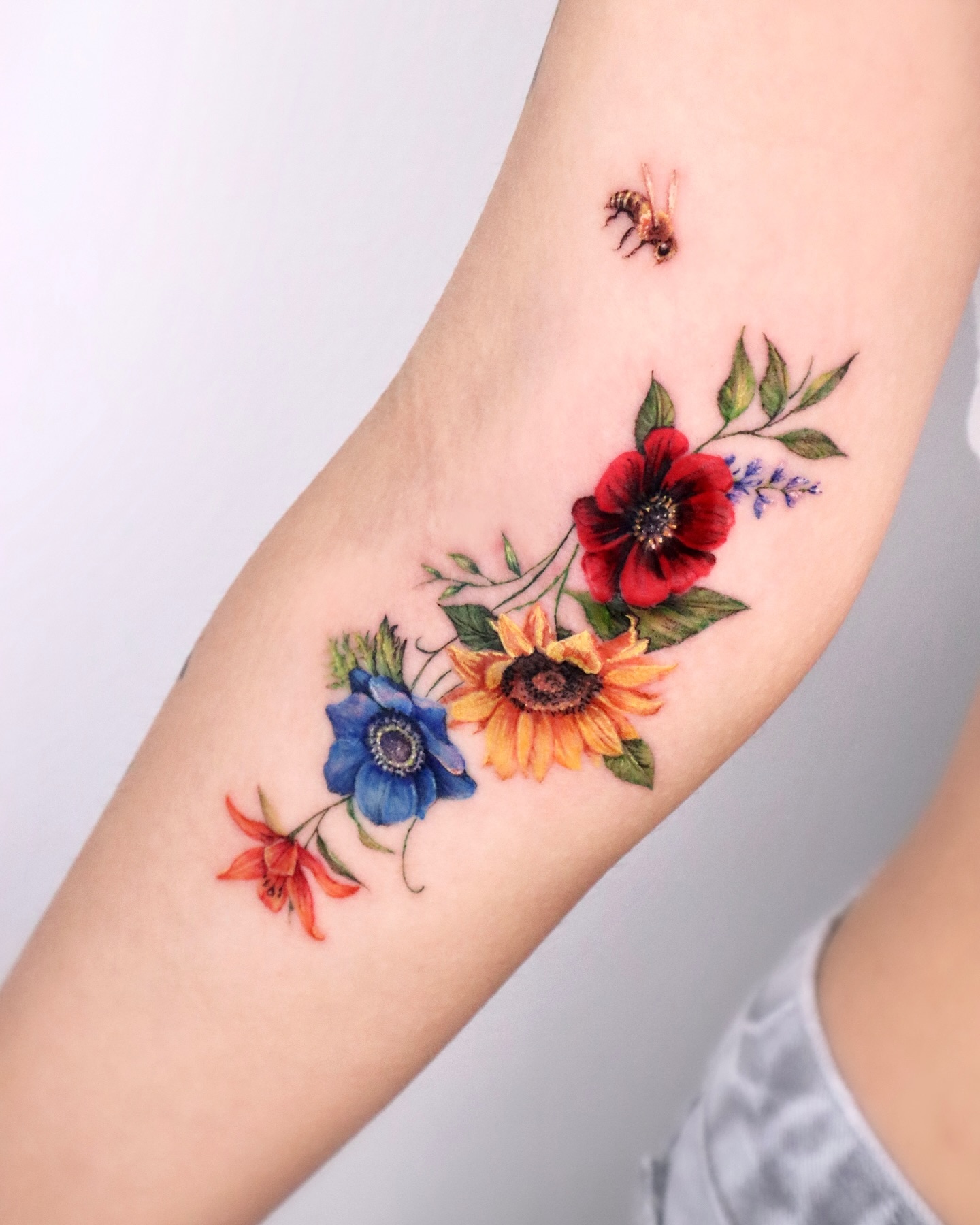 This tattoo features a vibrant mix of flowers, including red poppies, blue anemones, and yellow sunflowers, delicately intertwined with green leaves.