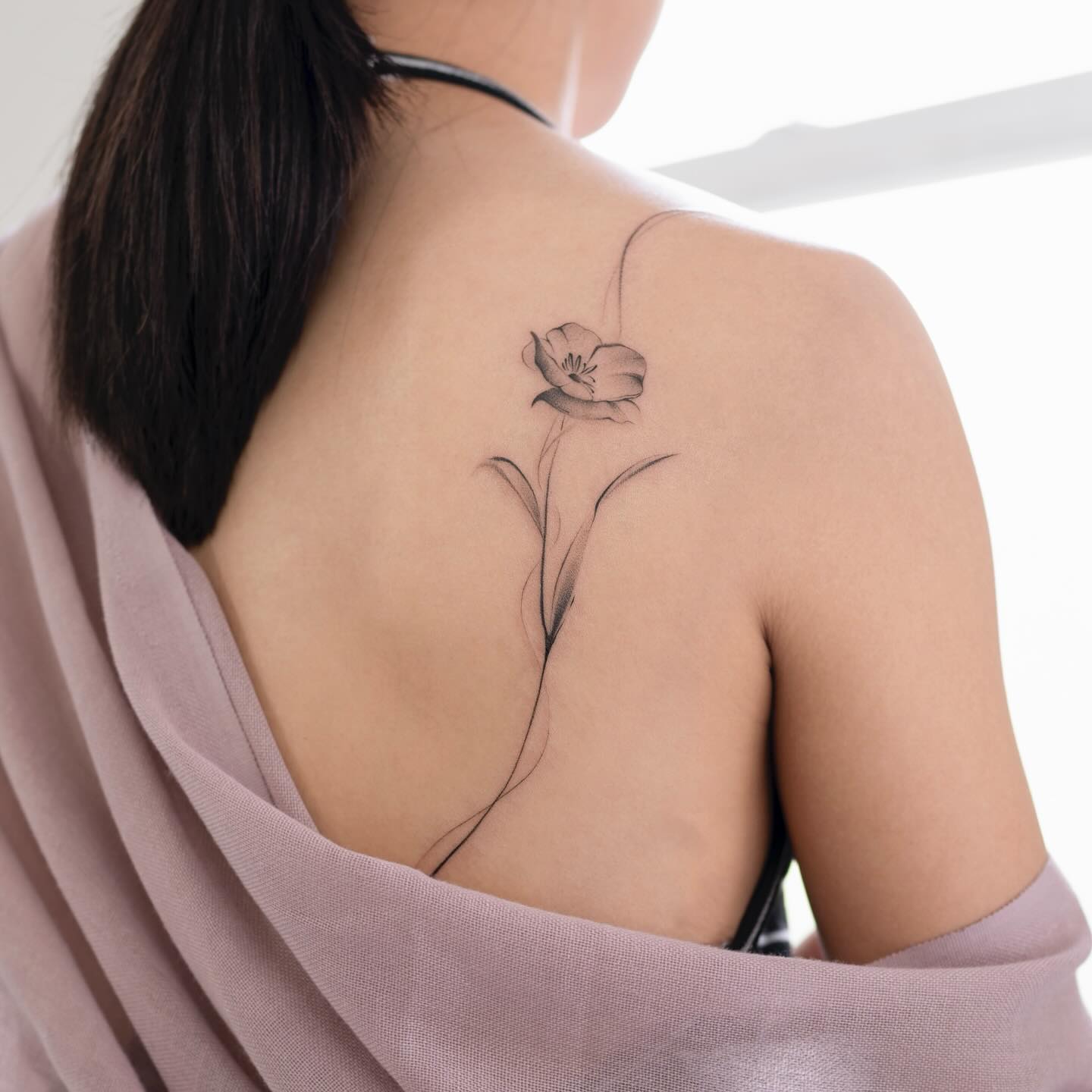 The tattoo showcases a finely detailed poppy flower positioned gracefully on the upper back.