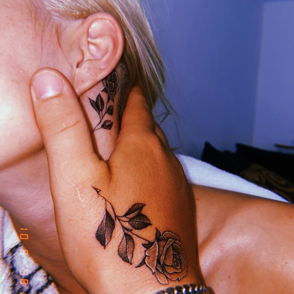 9. Matching Rose Tattoos on Hand and Neck