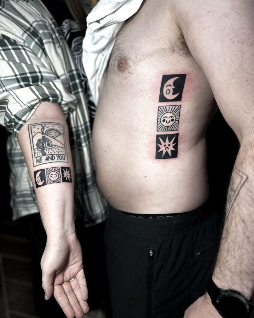 These unique tattoos feature bold, blocky designs of the moon, sun, and star, paired with additional imagery that reflects individuality like the words “Me and You” over a cozy house scene. One tattoo is placed on the forearm, while the other is on the ribcage, representing shared themes of balance, love, and connection. The striking blackwork style adds a modern, artistic flair to this deeply meaningful design.