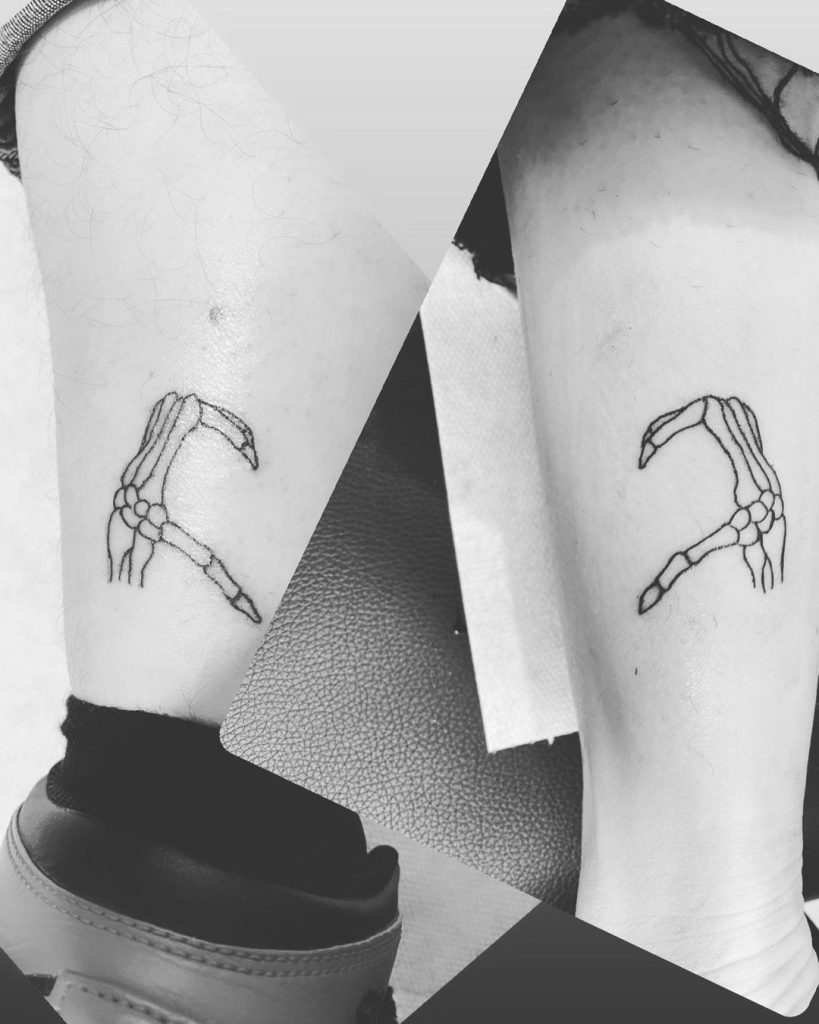 These tattoos feature skeletal hands forming a heart with their fingers, drawn in a clean, minimalist style. Placed on the legs, they mirror each other perfectly, symbolizing connection and unity. This edgy and unique design adds a bold, creative touch to their bond.