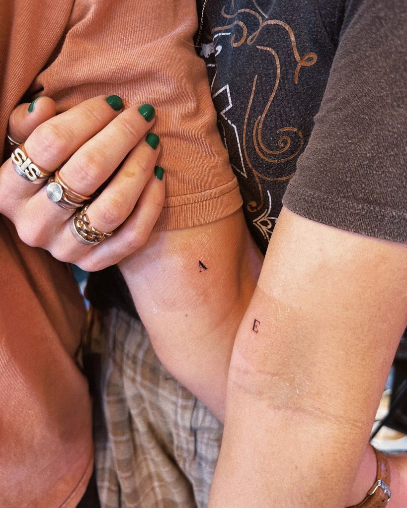 These minimalist tattoos feature the initials “A” and “E” inked delicately on the inner arms. The small, clean font adds an understated yet meaningful touch, symbolizing a personal and lasting connection. Positioned subtly, the initials represent a bond that s both intimate and timeless.