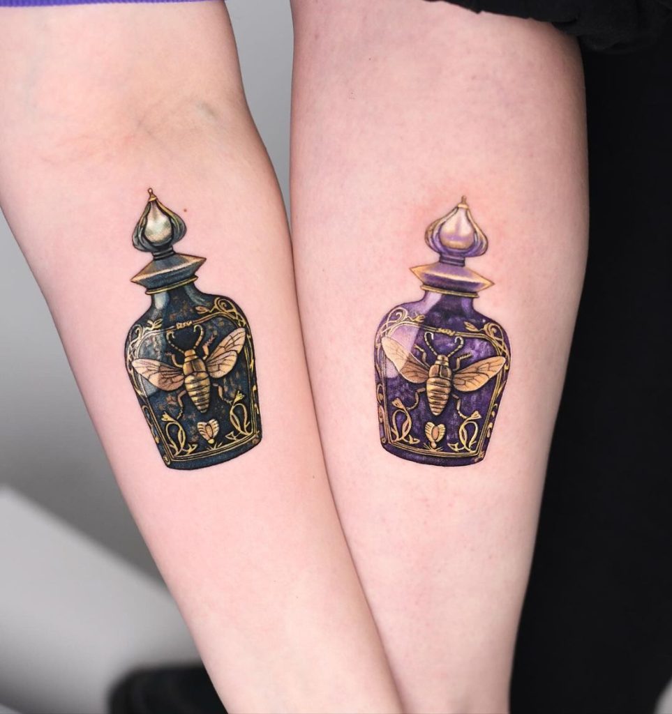 These tattoos feature elegant potion bottles in deep shades of black and purple, adorned with golden detailing and a central bee motif. The intricate designs give the bottles a magical, vintage feel, symbolizing mystery and transformation. Placed on the forearms, these matching tattoos highlight a shared connection with a whimsical and enchanting touch.