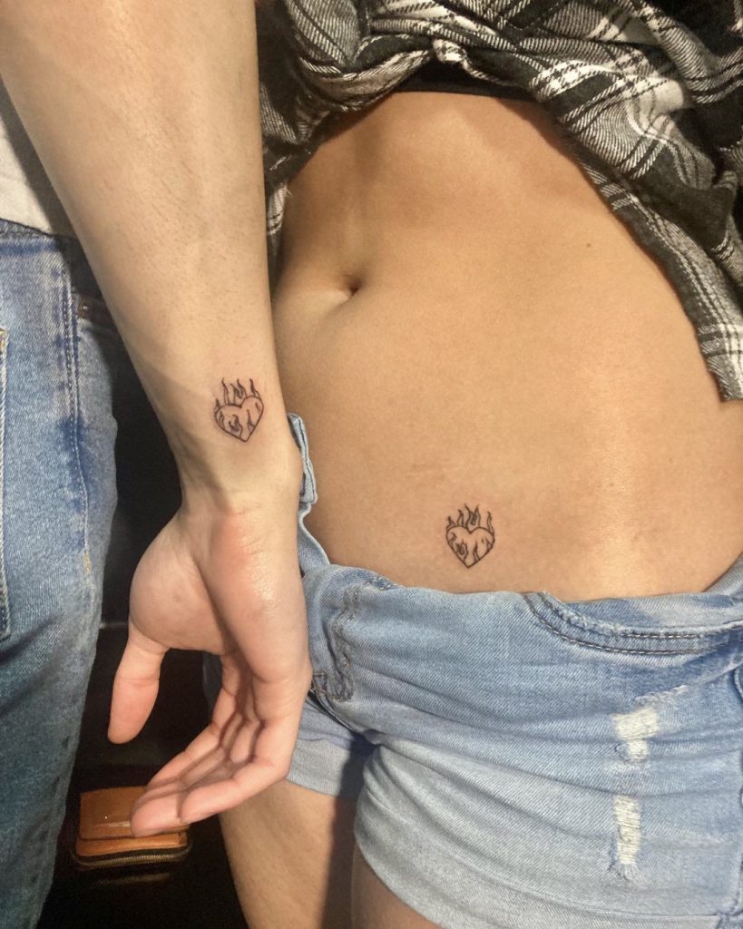 These matching tattoos feature a simple yet bold flaming heart design, with one placed on the wrist and the other on the hip. The fiery heart symbolizes passion and love, making it a perfect representation of a strong and intimate bond. The contrasting placements add a unique and personal touch to the design.