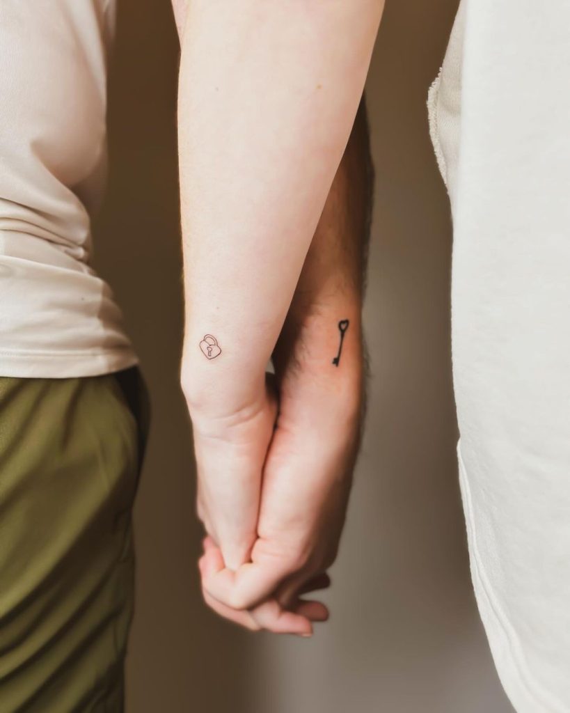 These minimalist tattoos feature a delicate outline of a heart-shaped lock on one forearm and a simple, slender key on the other. The design symbolizes the perfect fit and a unique connection between the pair. Placed subtly on the arms, the tattoos are a sweet and timeless nod to their bond.