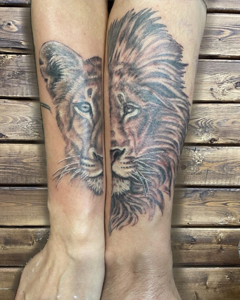 These tattoos showcase a majestic lion and a graceful lioness, each half on separate legs, forming a complete image when brought together. The intricate details in the fur and expressive eyes symbolize strength, unity, and love. This powerful design perfectly represents a bond of mutual respect and connection.