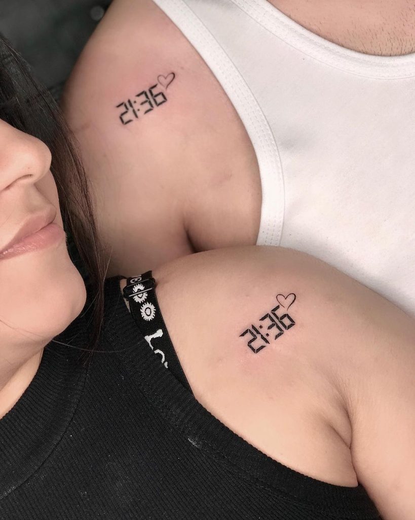 These tattoos display the digital time “21:36” with a small heart beside it, symbolizing a special moment shared between the pair. Placed on their shoulders, the design is simple yet deeply meaningful, capturing a time that holds significance in their relationship. The clean font and minimalistic style make it timeless and personal.