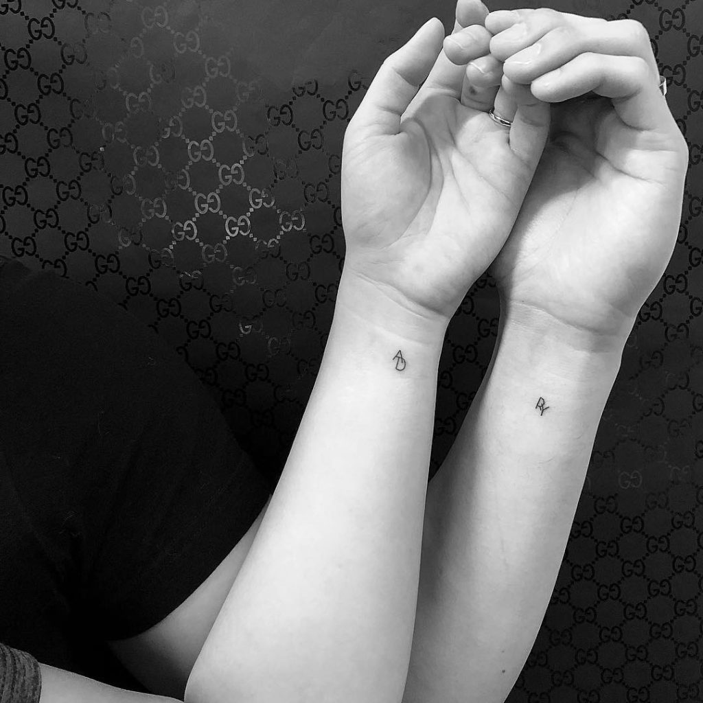 These minimalist tattoos feature small, delicate initials ”A” and “R” inked in a simple, elegant font. Positioned on the inner wrists, they are subtle yet meaningful, symbolizing a close and personal connection. The design s understated charm makes it perfect for a quiet but significant bond.