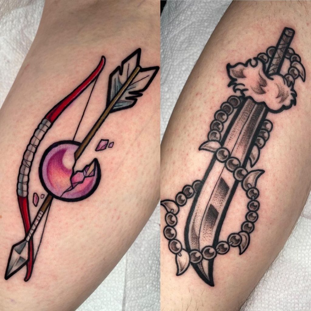 These complementary tattoos feature a sleek bow with a broken pink crystal arrow on one arm and a detailed sword wrapped in beads and cloud-like accents on the other. The vibrant colors of the bow and arrow contrast beautifully with the bold, black shading of the sword, symbolizing balance between precision and strength. Placed on the forearms, they create a striking duo that highlights partnership and unique individuality.