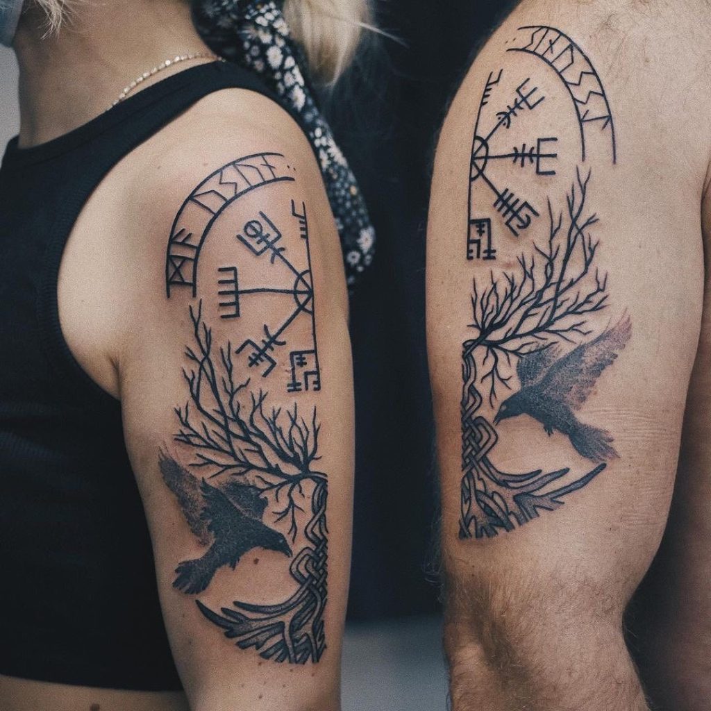 37. Matching Norse-Inspired Tree and Raven Tattoos