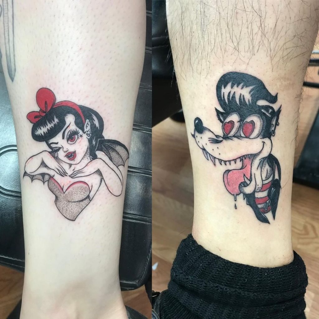 These playful tattoos feature a classic pin-up girl with bat-like wings and a smirking expression, paired with a cartoonish wolf sporting heart-shaped eyes and a goofy grin. The vibrant red accents add a pop of fun, symbolizing attraction and mischievous love. Placed on the legs, these quirky designs make a bold and unique couple’s statement.