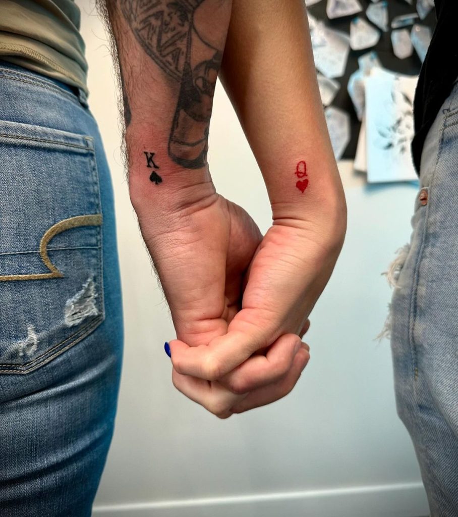 These matching tattoos showcase a black “K” with a spade on one wrist and a red crown with a heart on the other, perfectly symbolizing the bond of a king and queen. Placed on the inner wrists, the simple yet meaningful designs represent love and partnership when the couple s hands are held together.