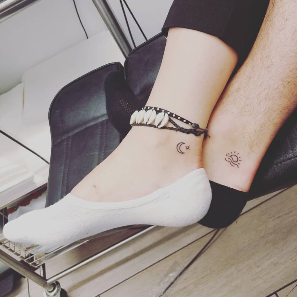 These simple yet elegant tattoos feature a crescent moon with a small star on one ankle and a rising sun with waves on the other. Representing night and day, they symbolize balance and harmony in the relationship. Perfectly placed on the ankles, these designs are subtle yet deeply meaningful.