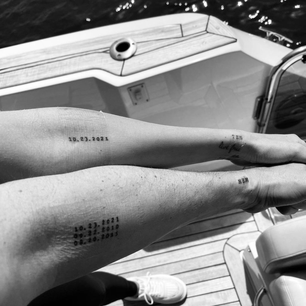 These tattoos highlight meaningful dates in a simple, typewriter-style font, with one forearm showcasing a single date and the other displaying a series of milestones. The minimalist design marks important moments shared by the pair, symbolizing their journey together. Placed prominently on the forearms, the tattoos are a timeless way to celebrate their connection.