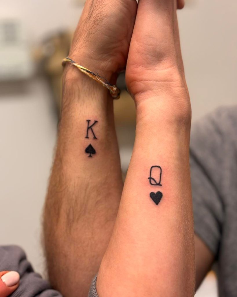 These tattoos feature bold card symbols, with a crowned “K” and spade on one forearm and a crowned “Q” with a heart on the other. The clean black ink and playing card theme represent a powerful partnership, with the king and queen complementing each other perfectly. Placed side by side, they symbolize unity and love in a strikingly simple design.