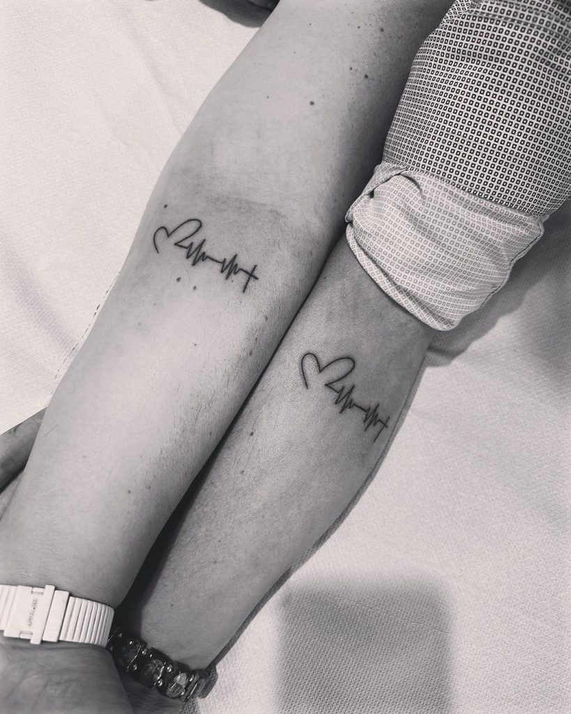 These matching tattoos feature a continuous heartbeat line ending in a simple heart, symbolizing love and connection. The clean, minimalist design reflects the steady rhythm of their shared bond. Placed on the forearms, these tattoos serve as a timeless reminder of their intertwined lives.