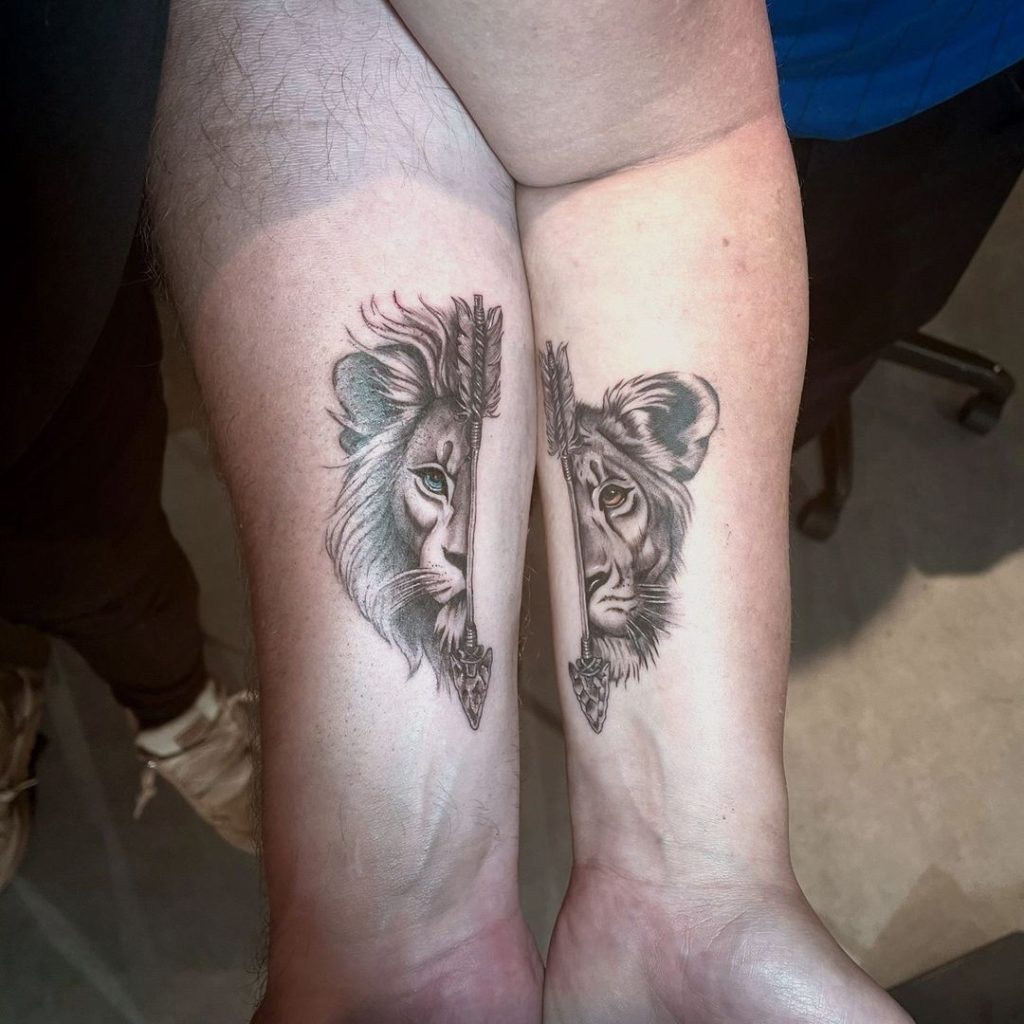 These tattoos feature a majestic lion and a fierce lioness, each design split by a detailed arrow. When the arms are placed together, the pair forms a complete image, symbolizing unity and balance. The intricate shading and sharp details highlight strength and partnership, creating a powerful and meaningful design.