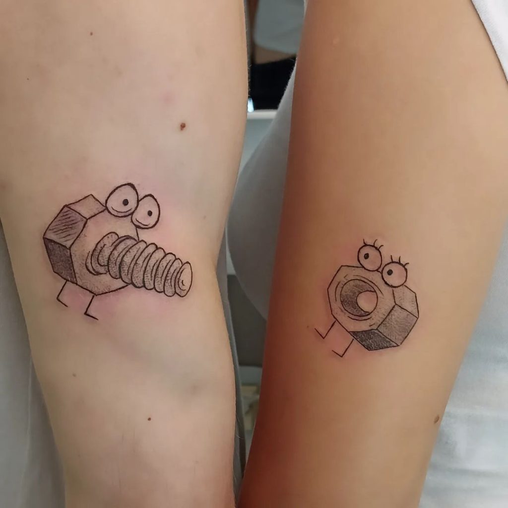 These playful tattoos feature a cartoonish screw and nut, each with expressive eyes and tiny legs, brimming with personality. The screw and nut represent a perfect fit and connection, symbolizing the complementary bond between the pair. Placed on the arms, these lighthearted designs bring fun and creativity to their shared story.