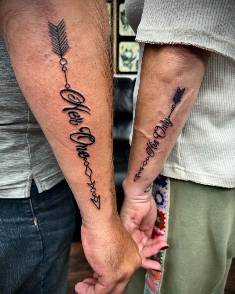 These tattoos feature a bold arrow design intertwined with the phrases “Her One” and “His Only” in elegant script. The arrow symbolizes direction and connection, while the meaningful words emphasize exclusivity and devotion. Placed on the forearms, these matching tattoos beautifully represent a strong and unbreakable bond.