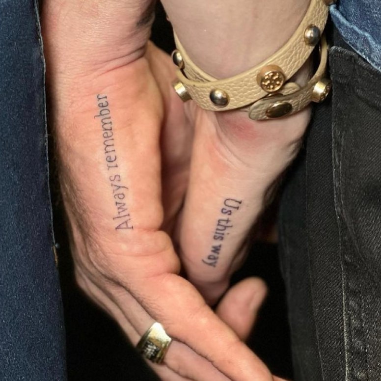 These tattoos feature a heartfelt phrase split between two hands: âAlways rememberâ on one and âUs this wayâ on the other. The simple, delicate font enhances the emotional meaning, making it a beautiful reminder of a cherished bond. Placed on the sides of the hands, the design comes together perfectly when the hands are held.