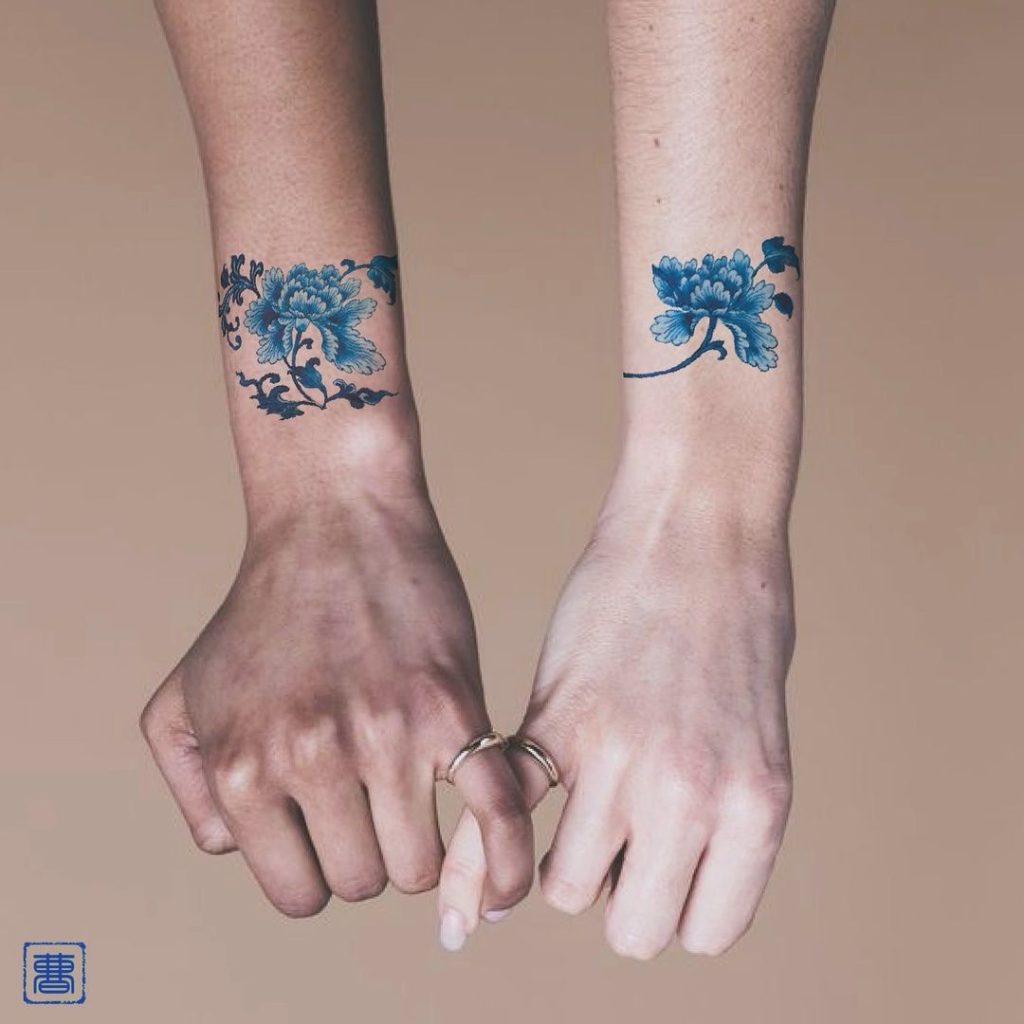 39. Matching Blue Floral Tattoos on Wrists
