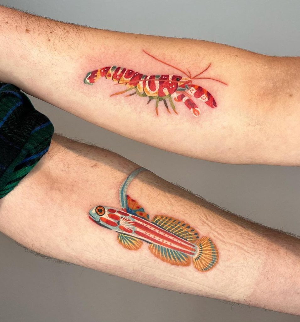 These vibrant tattoos feature a striking shrimp and a beautifully detailed goby fish, showcasing bright patterns and intricate designs. The duo symbolizes the symbiotic relationship between these two sea creatures, representing teamwork and harmony. Placed on the arms, these matching tattoos are a fun and meaningful nod to their unique bond.