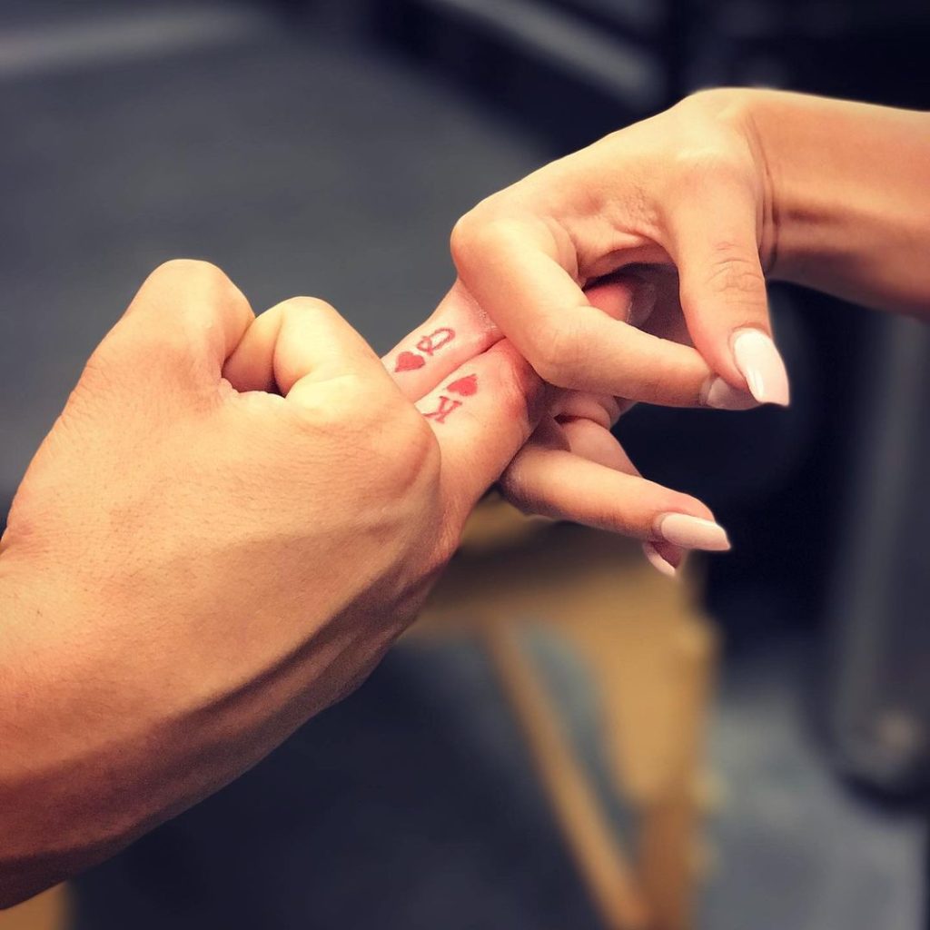 These delicate tattoos feature a red “K” and “Q” with hearts, placed subtly on the sides of the ring fingers. The playing card symbols represent a powerful bond between the king and queen, symbolizing love and partnership. Perfectly simple and meaningful, they are a timeless tribute to the relationship.
