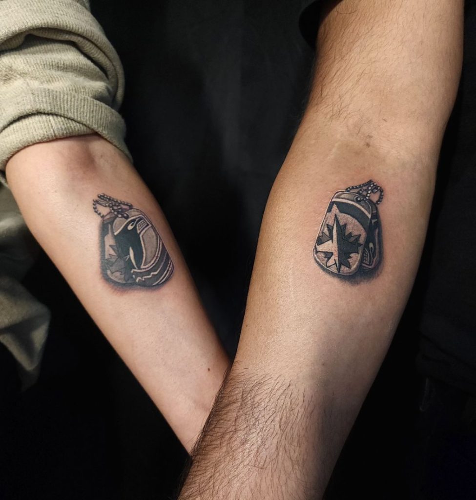 These tattoos feature two halves of a heart made from intricate fingerprints, one placed on each person’s arm. When combined, the design forms a complete heart, symbolizing individuality coming together in love. The fine details and thoughtful placement make this a beautifully personal and meaningful tattoo for the pair.