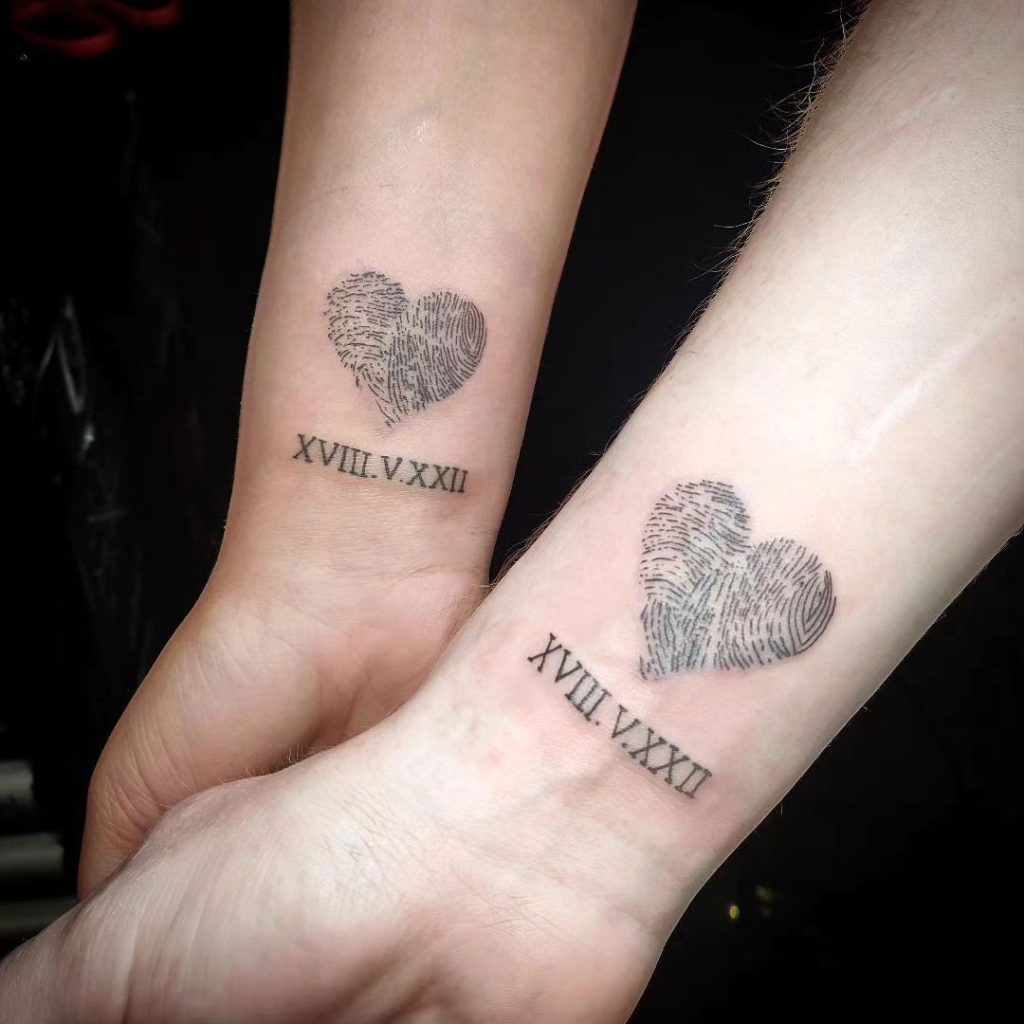 These tattoos feature a heart made from intertwined fingerprints, paired with a special date written in Roman numerals beneath. The unique fingerprint design symbolizes individuality coming together in love, while the date marks a significant milestone. Placed on the wrists, these matching tattoos are a heartfelt celebration of connection and commitment.