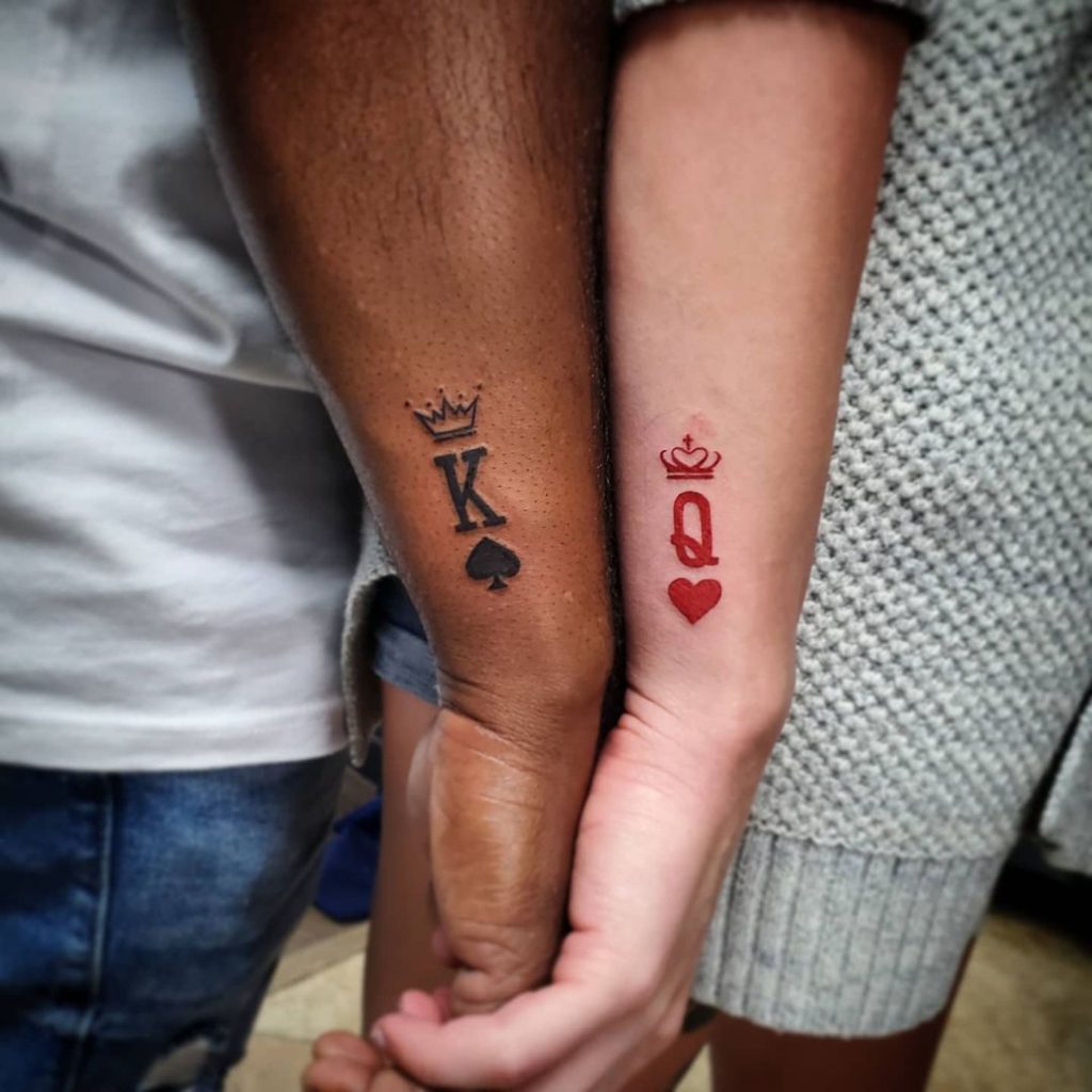 These tattoos feature a crowned “K” with a spade in striking black and a crowned “Q” with a heart in vibrant red. The bold card symbols celebrate the bond of a king and queen, representing strength and love. Positioned on the forearms, they create a perfect pair for a royal connection.