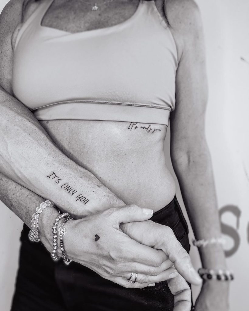 These tattoos feature the heartfelt phrase “It’s only you,” with one written on the inner arm and the other on the ribcage in simple, elegant fonts. The placement highlights intimacy and individuality while sharing the same meaningful message. Together, the design beautifully represents loyalty and devotion.