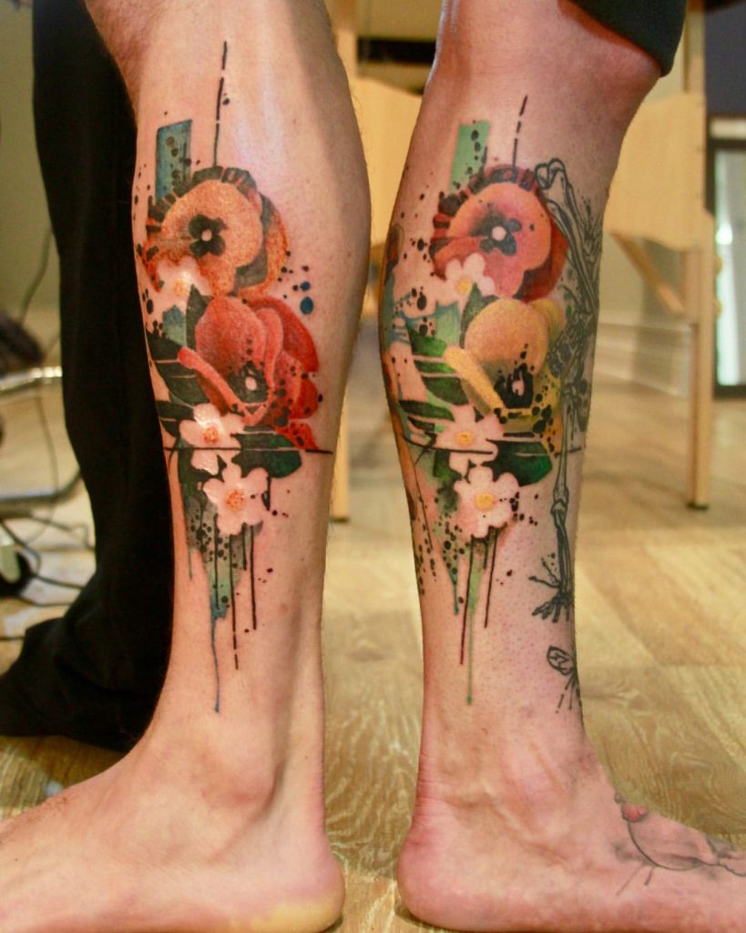 These vibrant tattoos feature bold, colorful flowers with splashes of paint-like details and abstract accents. When placed side by side, the designs blend beautifully, creating a striking, unified piece. The mix of soft florals and edgy, artistic elements symbolizes creativity and shared beauty.