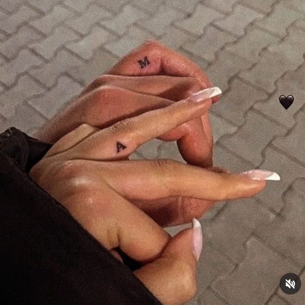 These subtle tattoos feature the initials “A” and “M,” each placed on the side of a finger for a discreet yet personal touch. The tiny, minimalist design symbolizes a close bond, made even more special by their placement on hands often held together. Perfect for celebrating a meaningful connection.