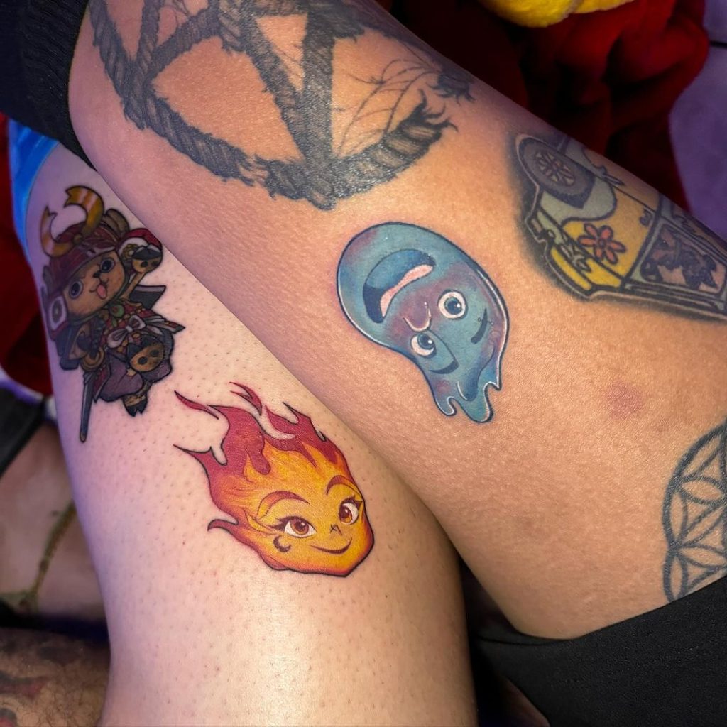 These vibrant tattoos feature a cheerful flame character on one arm and a goofy water droplet character on the other, representing the balance between opposites. The colorful designs are full of personality, symbolizing harmony and the fun dynamic of the pair. Placed on the forearms, they are eye-catching and bring a playful, lighthearted vibe.
