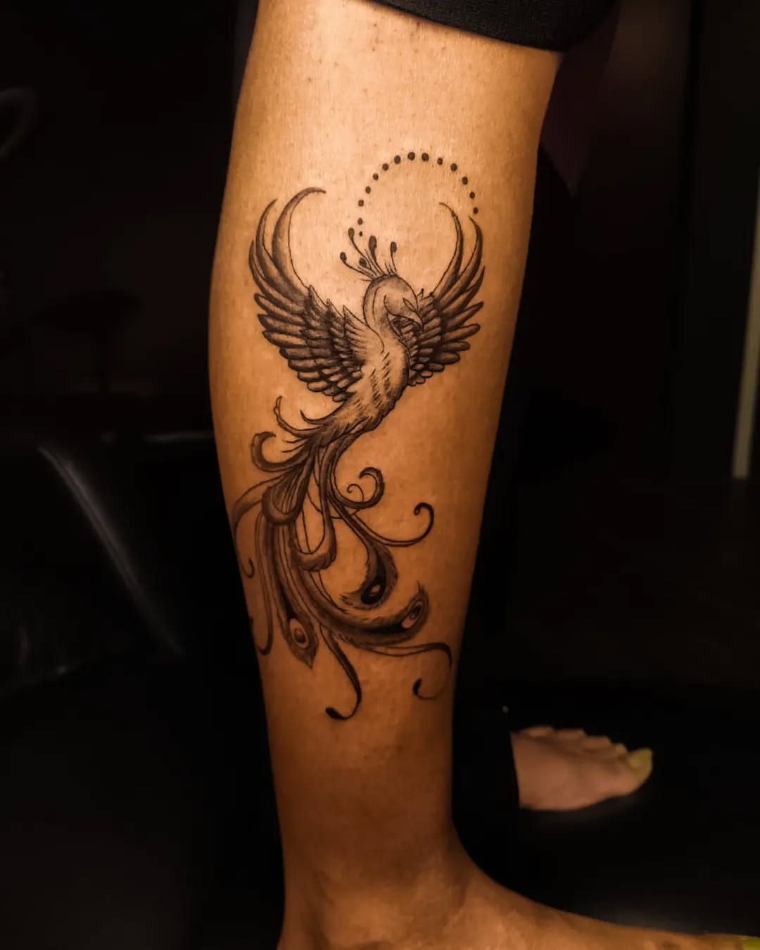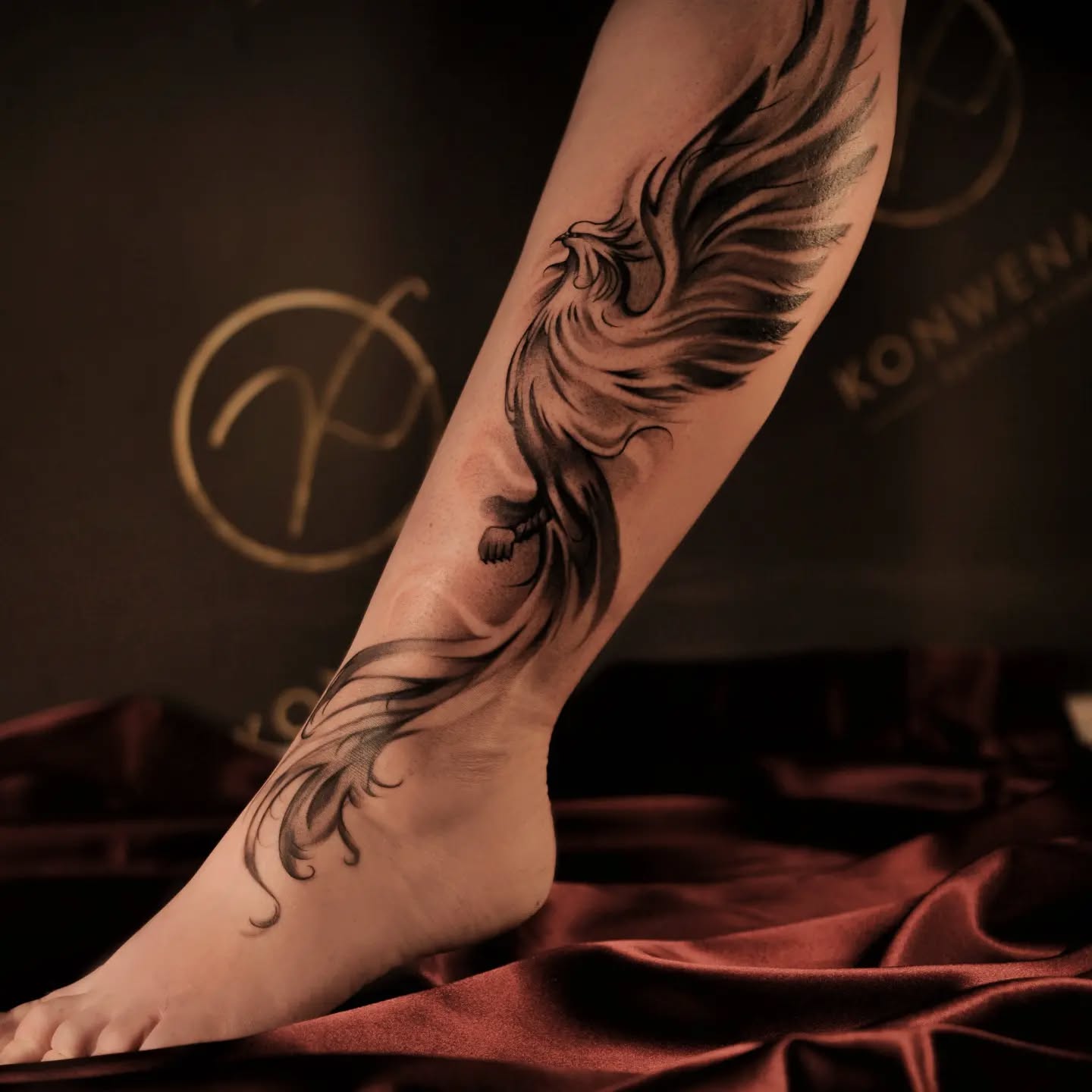 This stunning tattoo showcases a beautifully detailed phoenix, its wings elegantly flowing along the leg. The intricate design symbolizes rebirth and strength, making it a meaningful choice for women looking to express their resilience. Choosing the right placement can enhance the tattoo s impact, drawing attention to its graceful curves and vibrant energy.