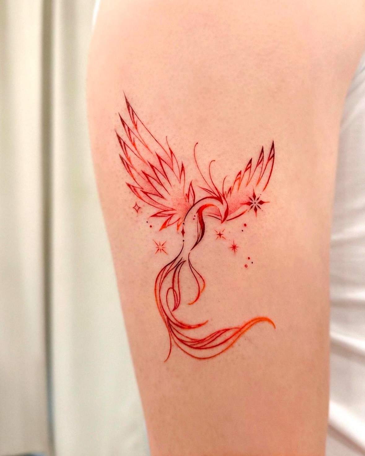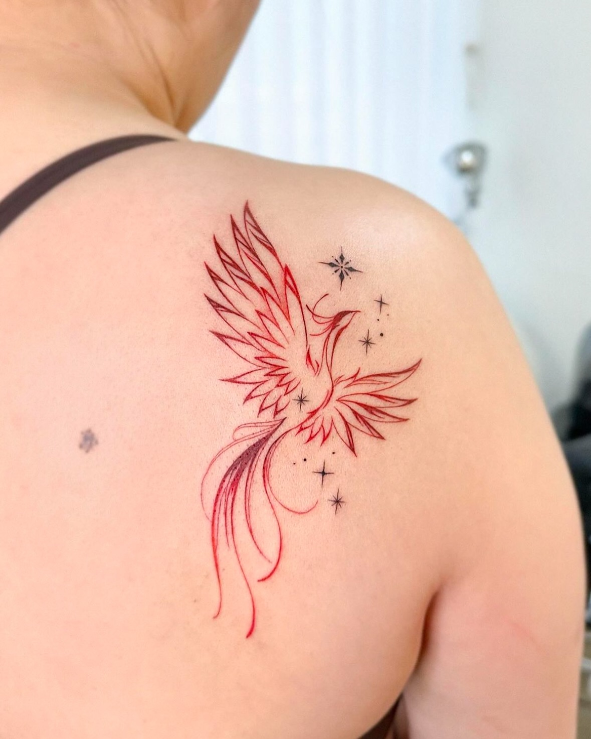 This striking phoenix tattoo showcases a beautiful blend of red hues and delicate lines, capturing the essence of rebirth and strength. The added stars around the bird give it a mystical touch, making it a unique piece for any woman looking to express her journey. When choosing a phoenix design, consider how the colors and placement resonate with your personal story.