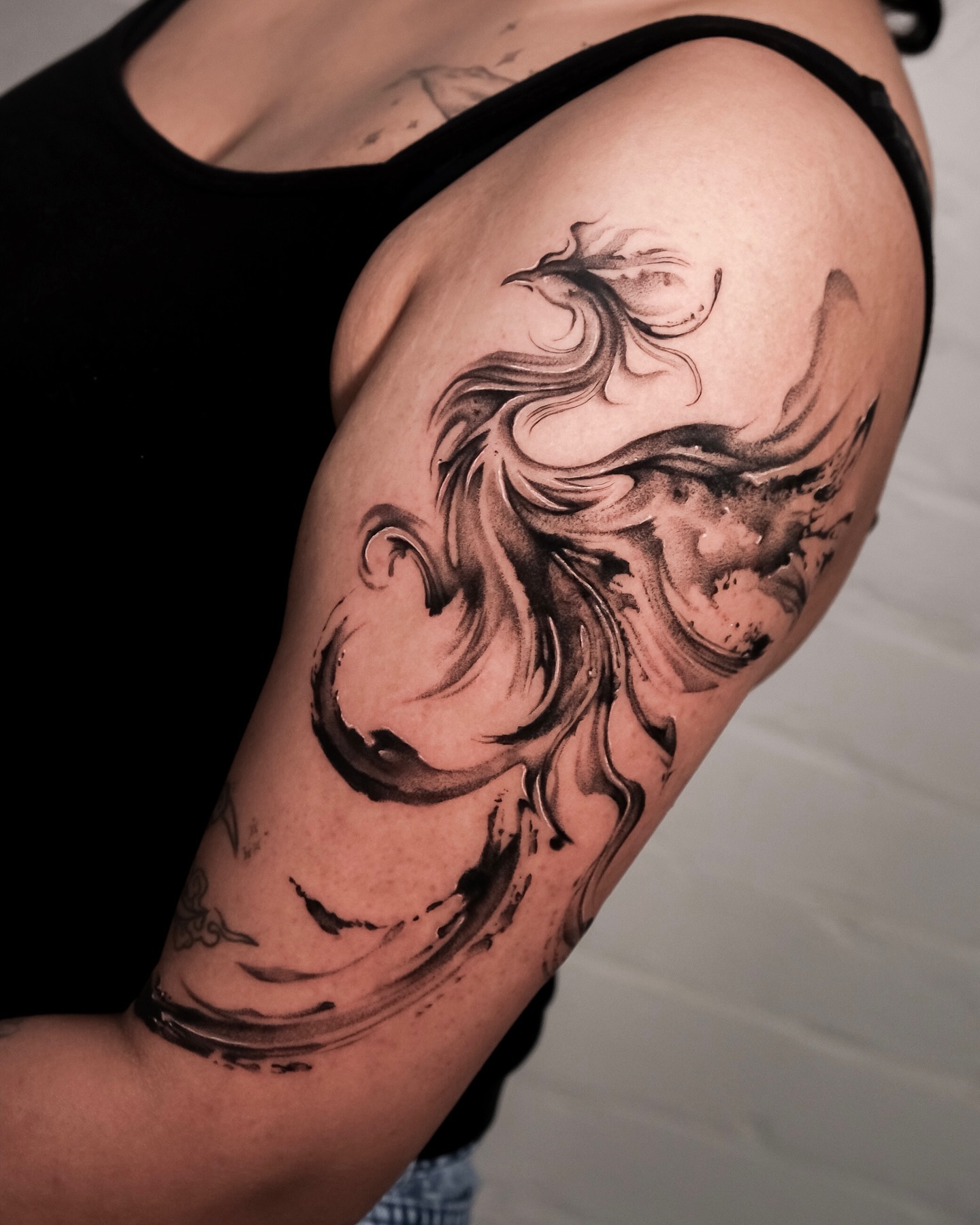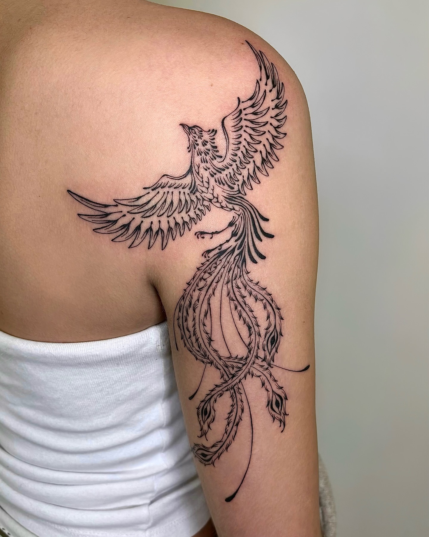 This stunning image showcases a beautifully designed phoenix tattoo on a woman’s shoulder, symbolizing rebirth and strength. The intricate details and flowing lines of the tattoo make it a remarkable piece of art that enhances her natural beauty. For those considering their own phoenix tattoo, choosing a design that resonates personally can make it even more special.