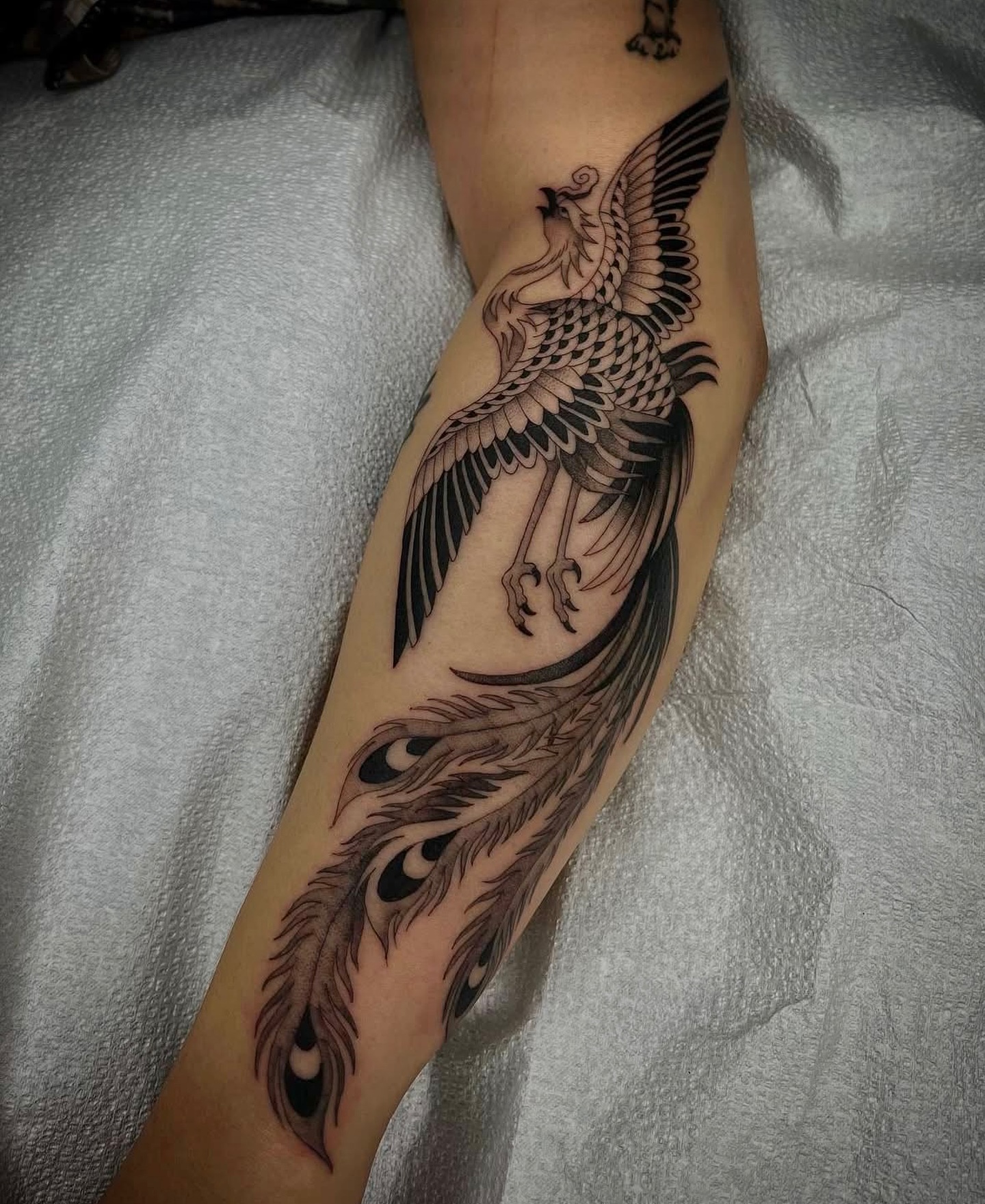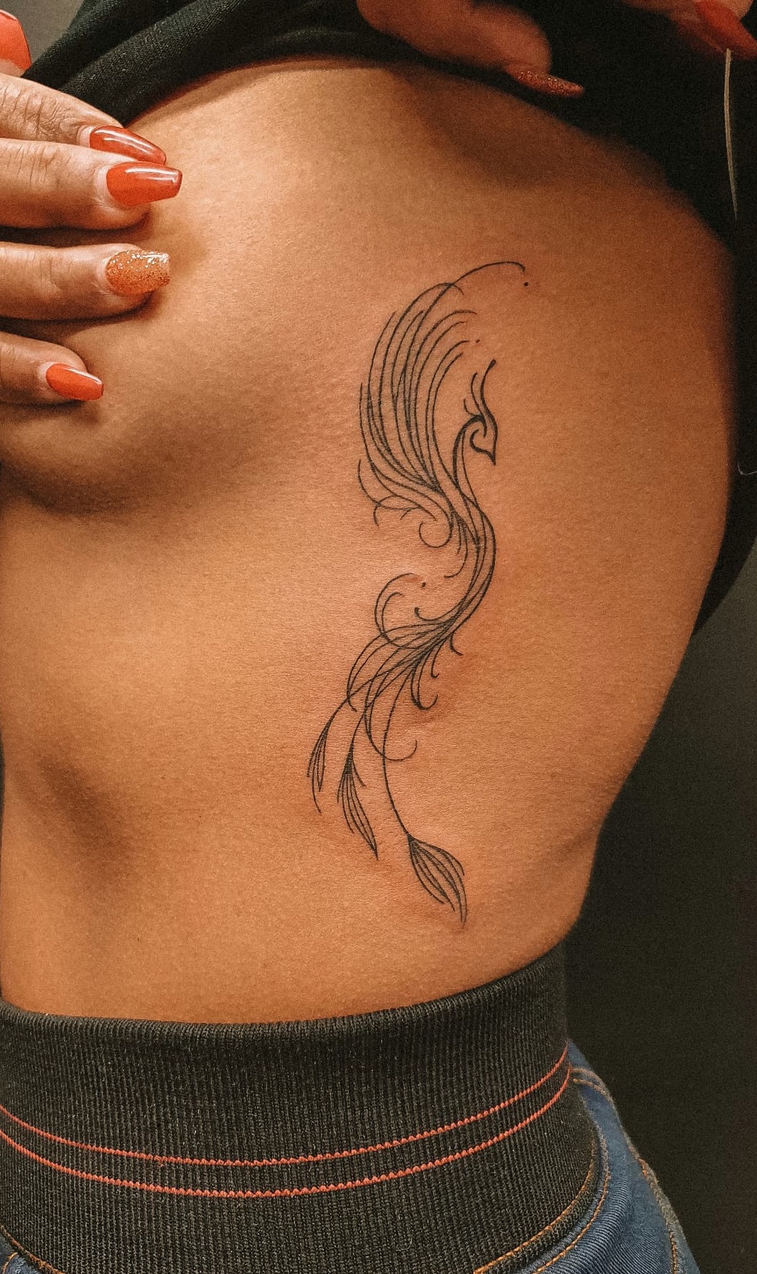 This stunning tattoo beautifully captures the elegance of a phoenix in a flowing, artistic style. The intricate lines and graceful curves create a sense of movement, symbolizing rebirth and strength. For those considering a tattoo, choosing a design that resonates with personal meaning can make it even more special.