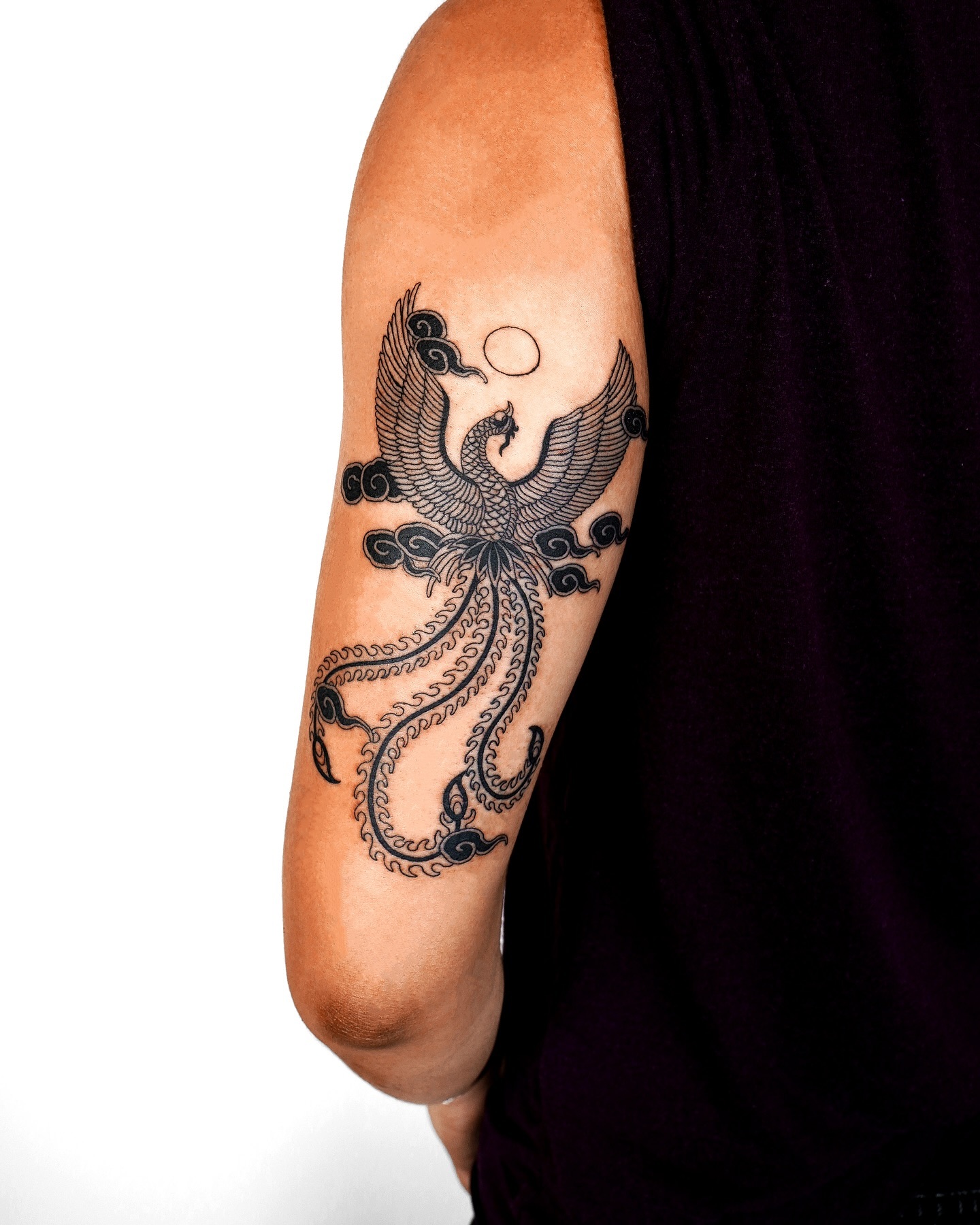 This stunning tattoo features a phoenix in flight, surrounded by swirling clouds, embodying strength and rebirth. The intricate details and bold lines create a mesmerizing design that tells a powerful story of transformation. For those considering a phoenix tattoo, choosing a design that resonates personally can make the artwork feel even more special.