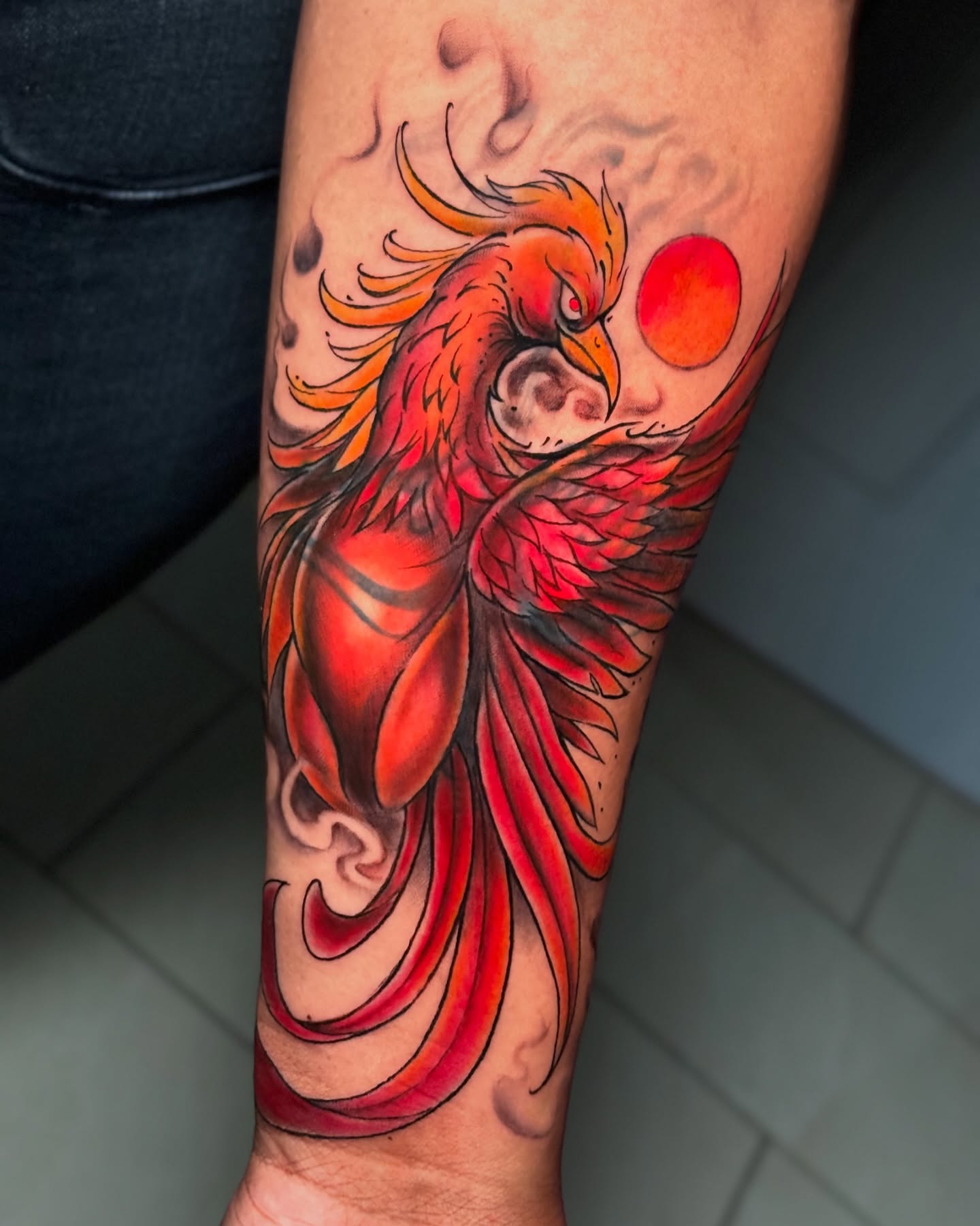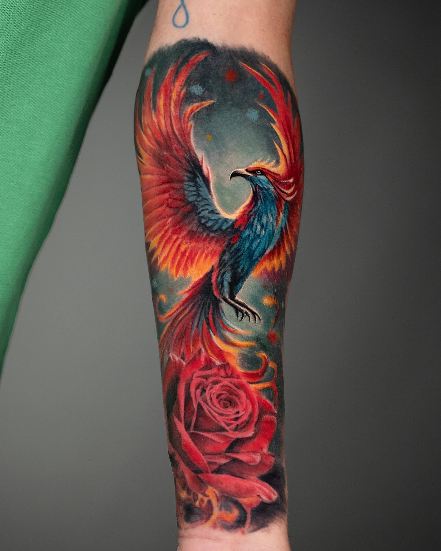 This stunning tattoo showcases a beautifully detailed phoenix in vibrant colors, symbolizing rebirth and resilience. The graceful lines and fiery accents create a dynamic look that stands out on the arm. For those considering a phoenix tattoo, choosing colors that resonate personally can make the design even more meaningful.