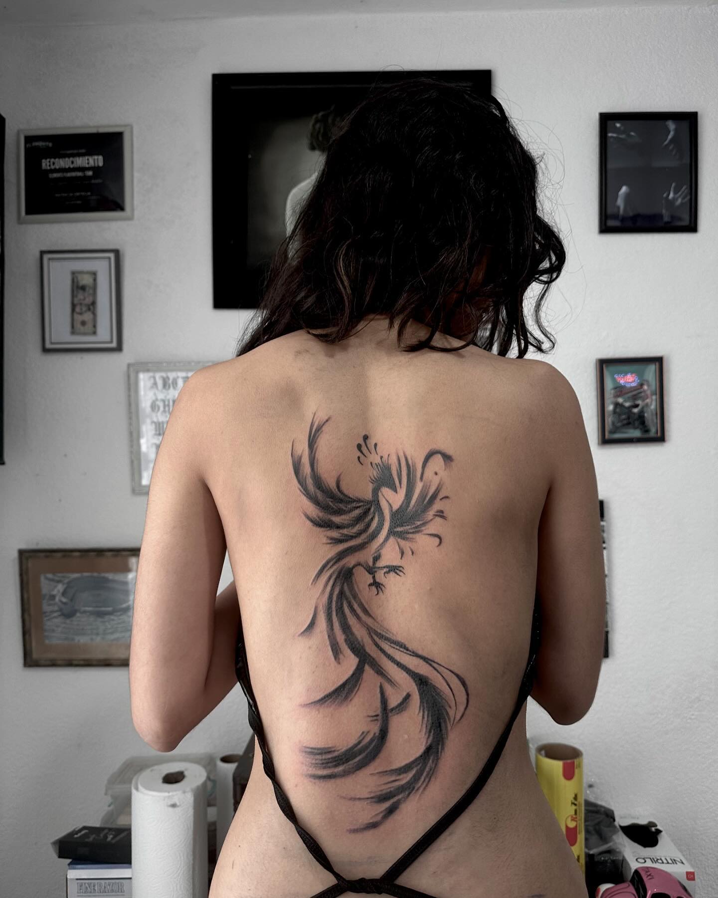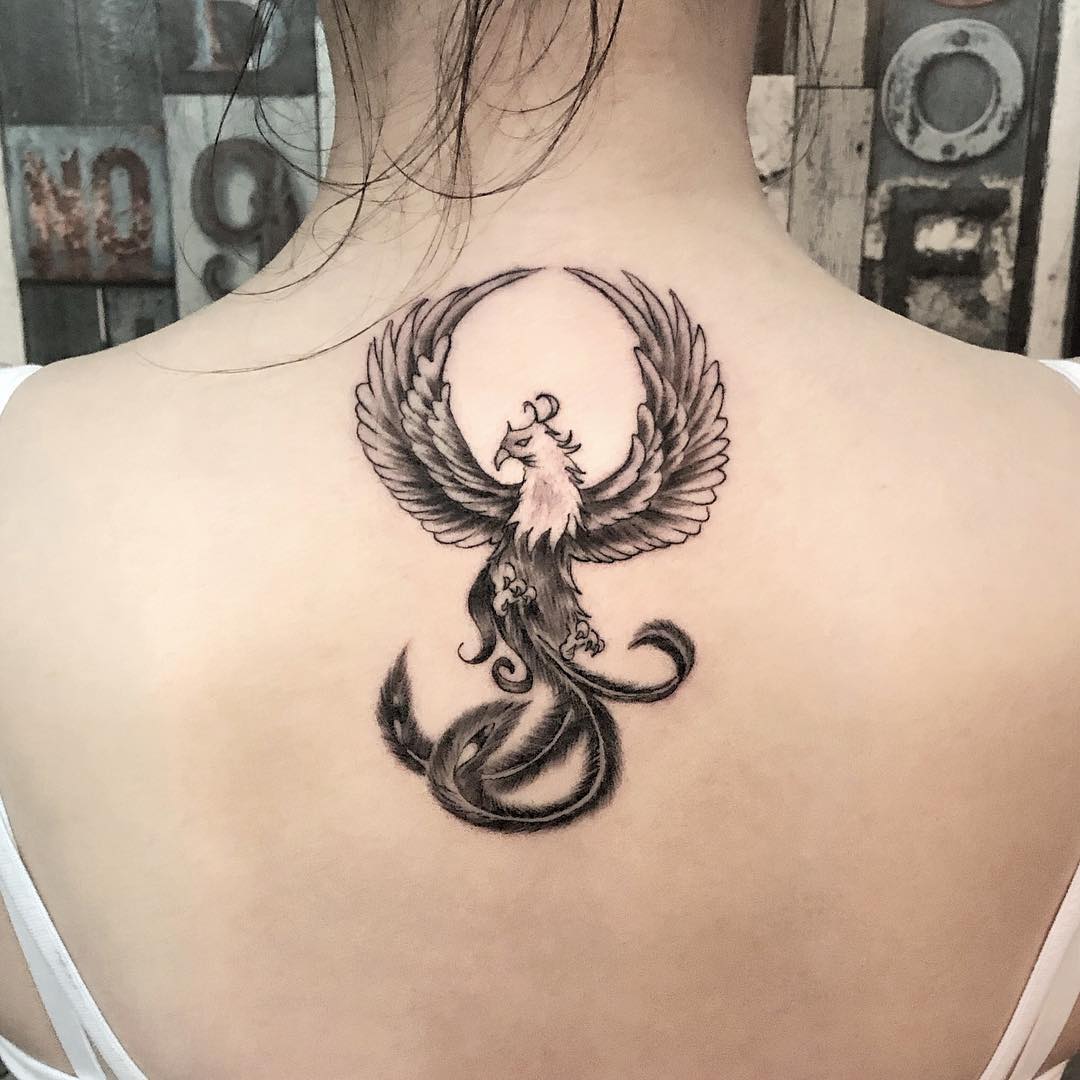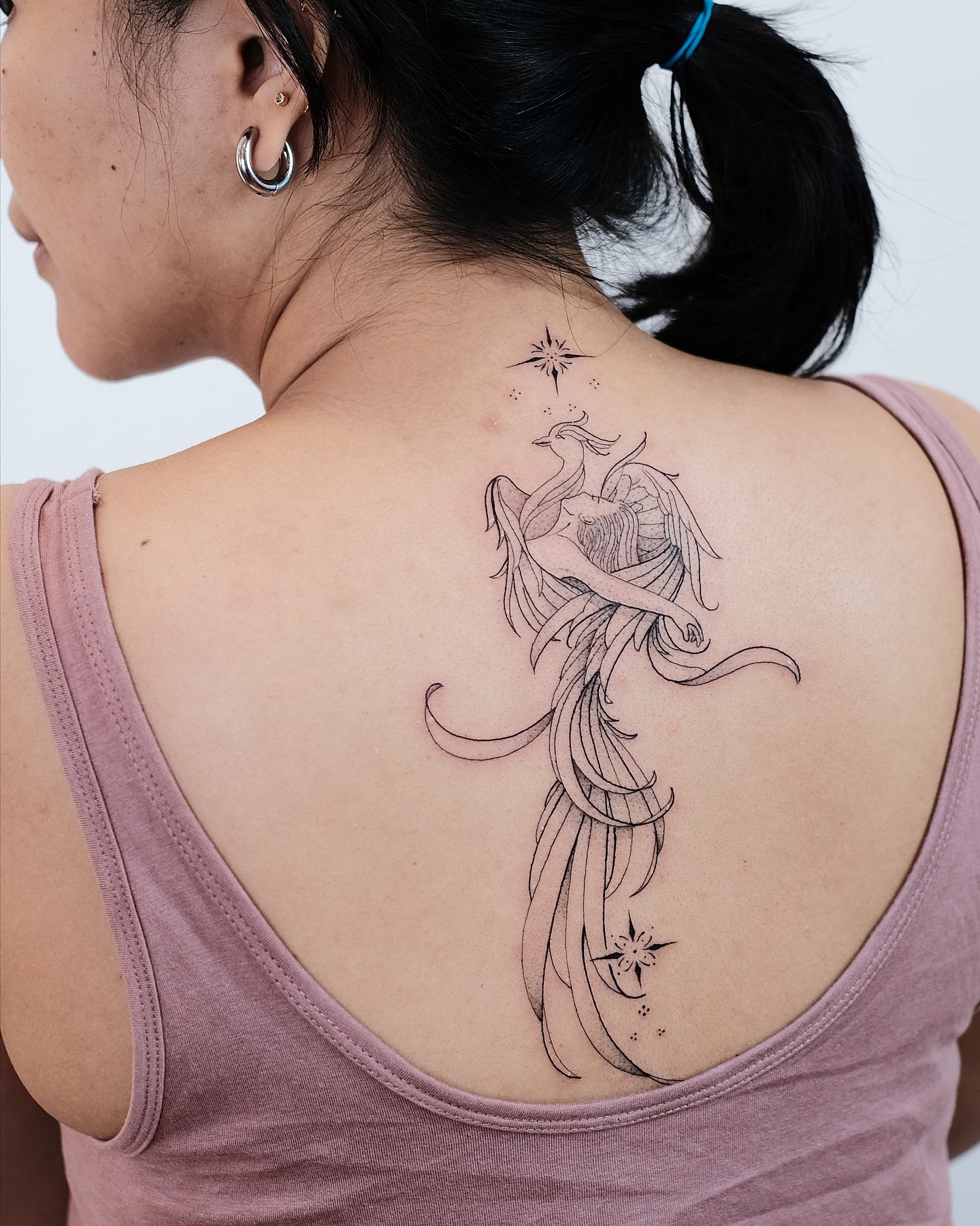 This stunning tattoo captures the graceful form of a phoenix, elegantly designed on the woman’s back. The delicate lines and flowing shapes give it a sense of movement, symbolizing rebirth and resilience. For those considering a phoenix tattoo, it’s a beautiful reminder of strength and transformation, making it a meaningful choice.