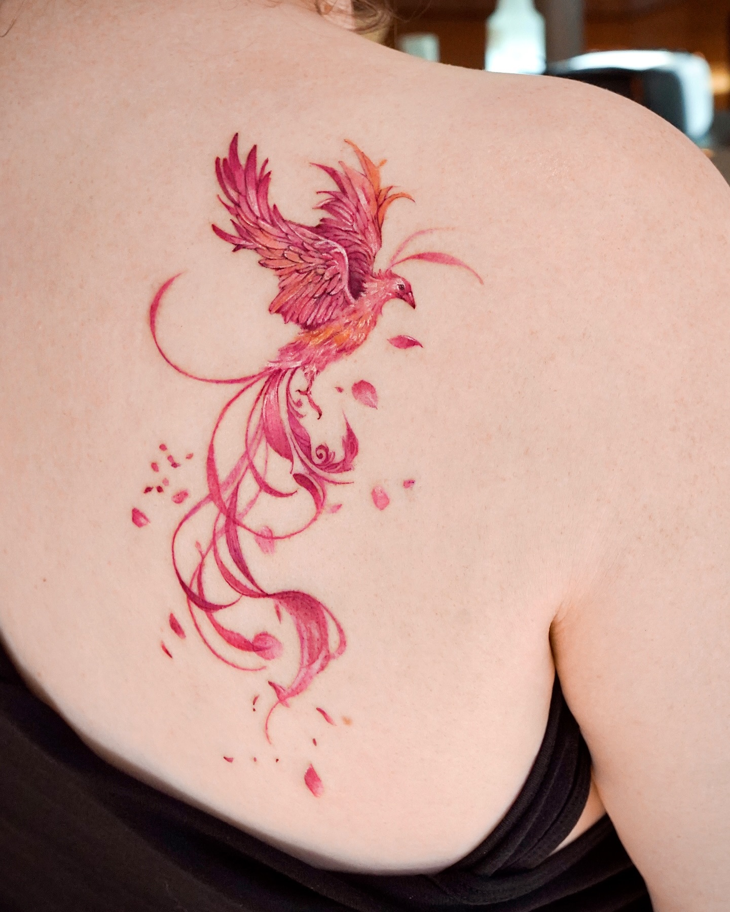 This stunning tattoo showcases a vibrant phoenix in mid-flight, surrounded by delicate swirls and petals that add a touch of elegance. The mix of pinks and reds brings the design to life, symbolizing rebirth and strength. For women considering a phoenix tattoo, choosing a design that resonates personally can make the piece even more meaningful.